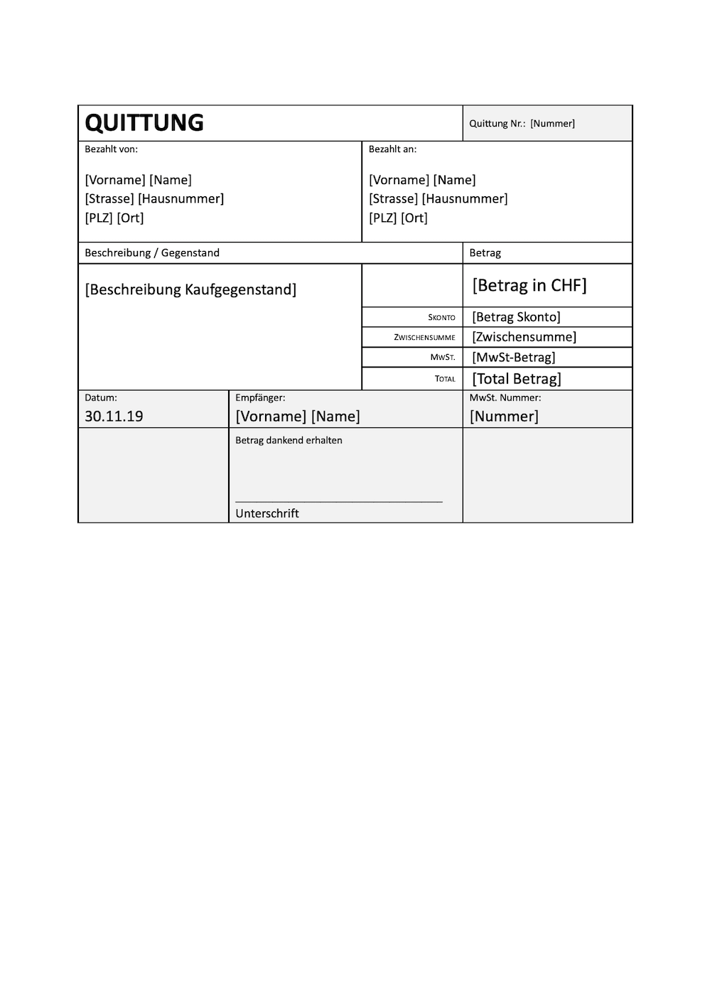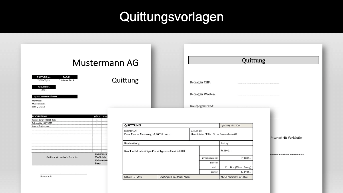 Auf dem quittungsvordruck muss der name des schuldners der zweck der zahlung die höhe des gesamtbetrages die höhe des nettobetrages die mehrwertsteuer der ort und das datum des erhalts der zahlung sowie die unterschrift und der stempel des empfängers vorhanden sein. Du kannst im internet nach einer quittung vorlage excel quittung vorlage word oder quittung vorlage pdf suchen so musst du dir kein eigenes design überlegen sondern kannst ein bereits bestehendes muster nutzen. Wenn sie auf der suche nach einer quittungsvorlage sind sind sie bei uns genau richtig wir bieten ihnen kostenlos zwei verschiedene quittungsvorlagen für geschäft und privatpersonen an. Kostenlose quittungsvorlage für die schweiz mit oder ohne mehrwertsteuer mwst im word excel format.