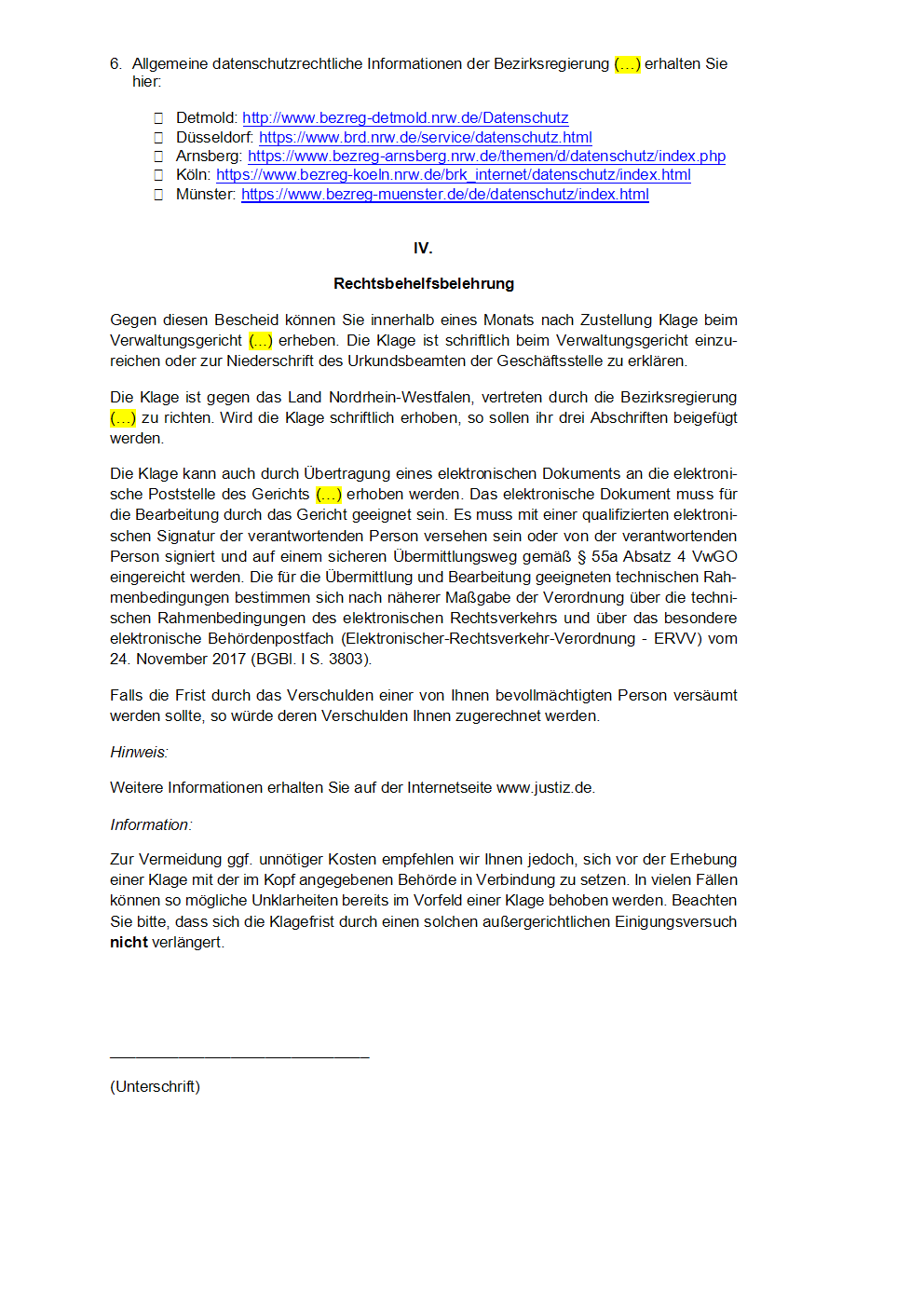 Rechtsbehelfsbelehrung nrw muster. Mai 1997 gmbl 1997 s. Dieser bußgeldbescheid wird rechtskräftig und vollstreckbar wenn sie nicht innerhalb von zwei wochen nach seiner zustellung schriftlich oder zur niederschrift bei der umseitig genannten behörde. 1 satz 1 vwgo. Ist deren sitz und frist ordnungsgemäß belehrt wurde.