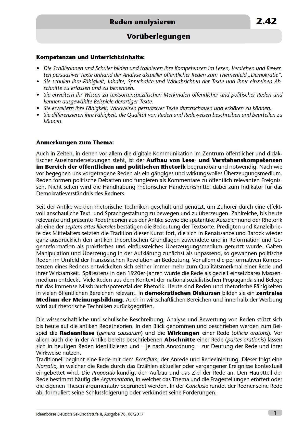 Rede analyse deutsch klausur beispiel. Februar 1943 im berliner sportpalast anmerkung. Rede reden an die deutsche nation gehalten von dem deutschen philosophen johann gottlieb fichte als vorlesung in berlin im jahre 1807 1808 und herausgegeben von rudolf euchen im jahre 1915 thematisiert die deutsche nation und welche dinge die deutsche bevölkerung tun soll um den untergang der nation entgegenzuwirken. Im fachbereich deutsch wird oft ein schwerpunkt auf die verwendeten rhetorischen mittel stilmittel des redners gelegt wohingegen die geschichtswissenschaft einen stärkeren fokus auf den historischen kontext legt im bereich der fremdsprachen sind die anforderungen an die redeanalyse vergleichsweise gering da das sprachliche niveau selbstverständlich um ein vielfaches geringer ist. Der auszug aus der 14.