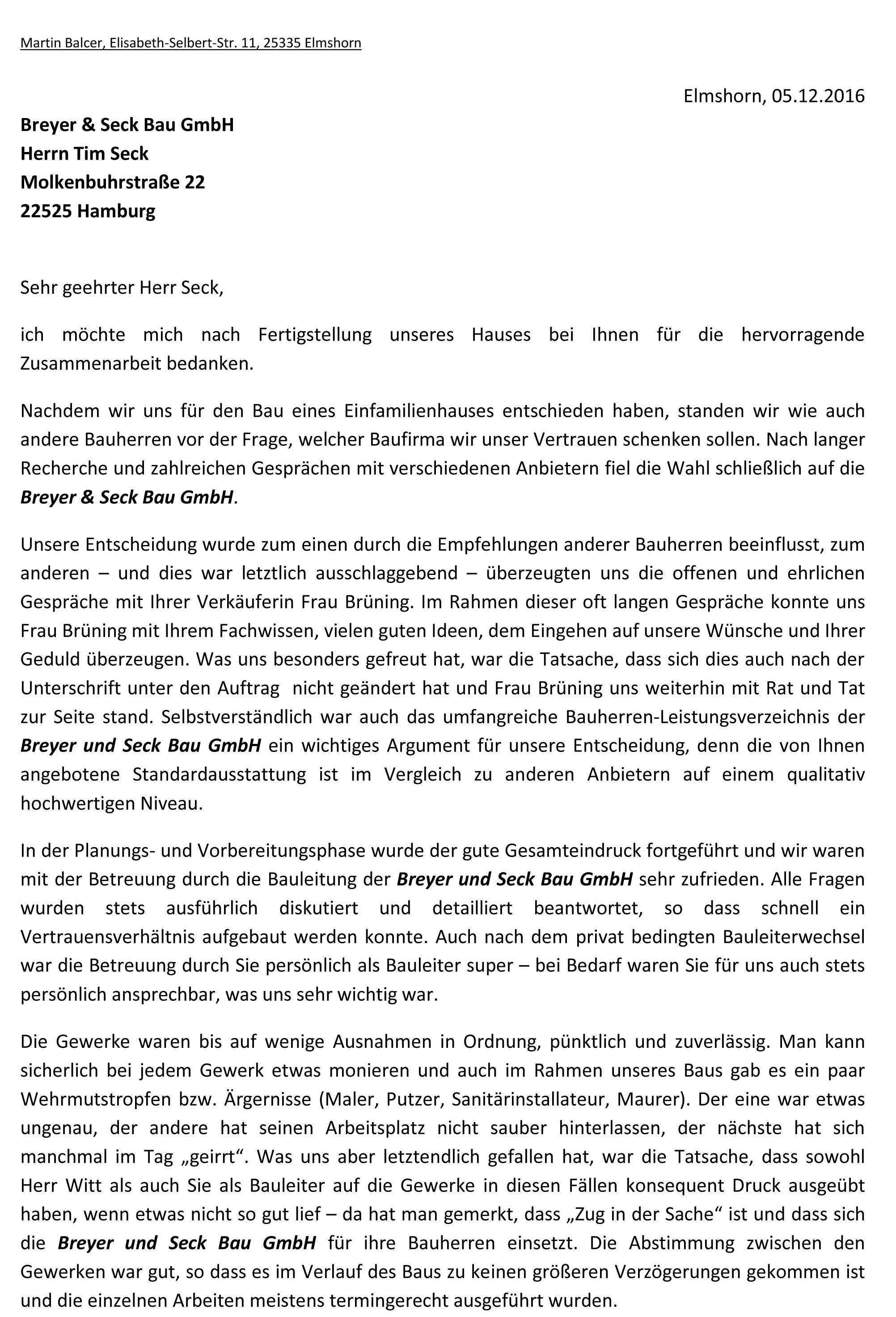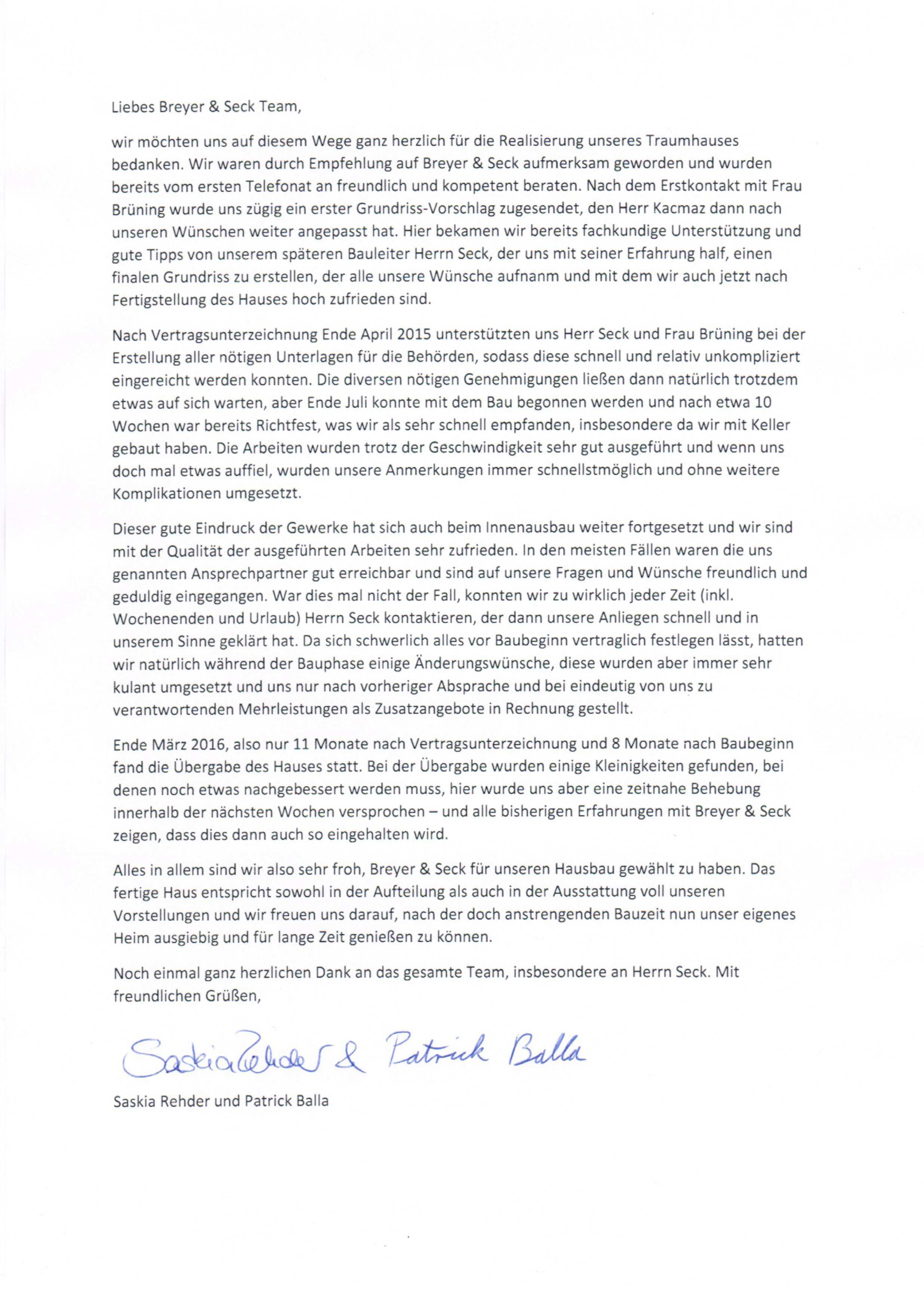 Referenzschreiben herr rene poplawski bauleiter breyer seck für bauvorhaben rümeland 8 in 22927 großhansdorf herr poplawski hat unser hausbauprojekt in großhansdorf rümeland 8 das wir mit der baufirma breyer seck realisiert haben als bauleiter von april 2014 bis februar 2015 betreut und uns um diese referenz gebeten.