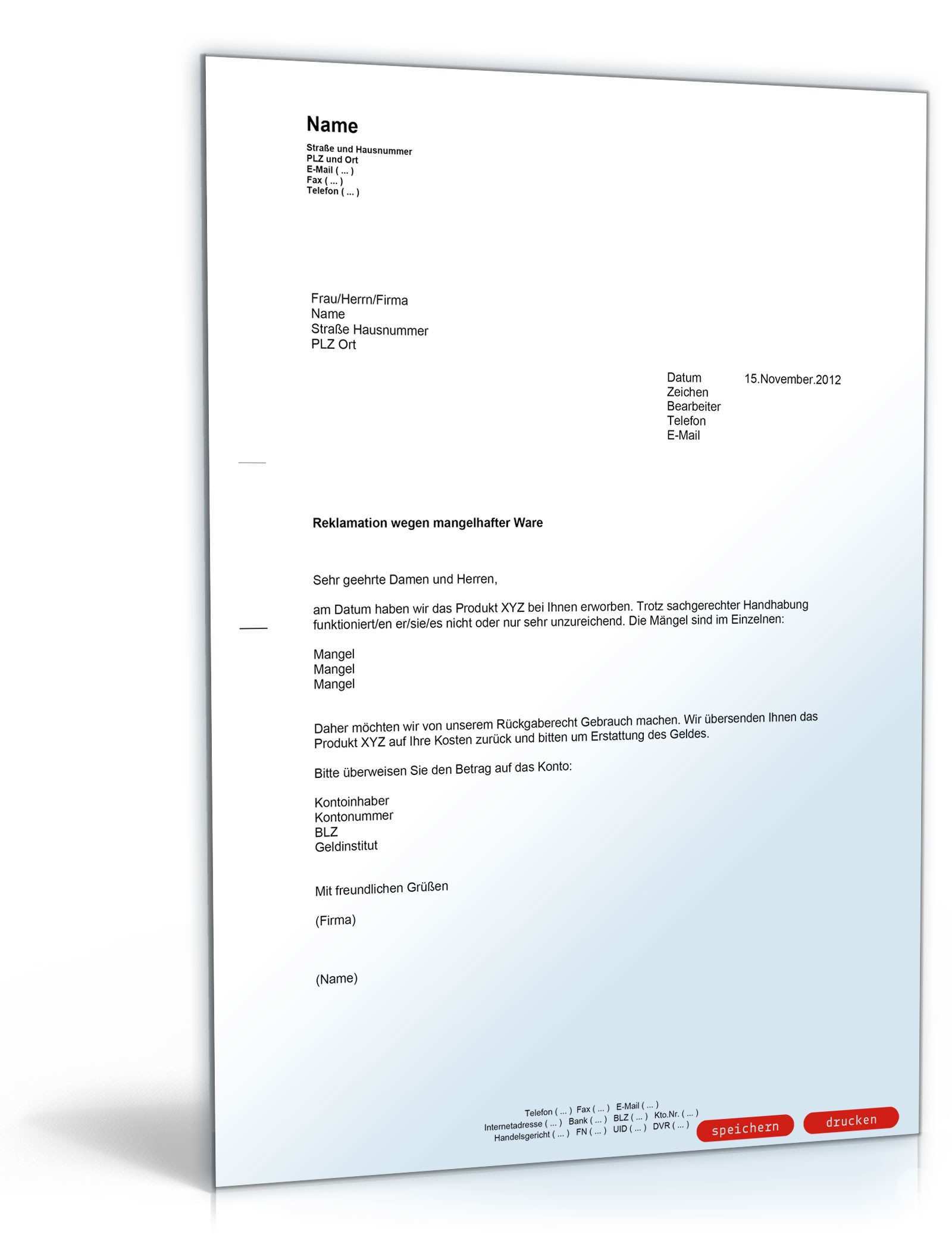Reklamation nennt man die beanstandung schadhafter ware durch den käufer. Hier finden sie vorlagen beispiele und muster dazu. Danach kann der käufer eine beseitigung des mangels zum beispiel durch reparatur oder die lieferung eines mangelfreien produkts verlangen umtausch. Im impressum des onlineshops bitte heutiges datum einfügen.