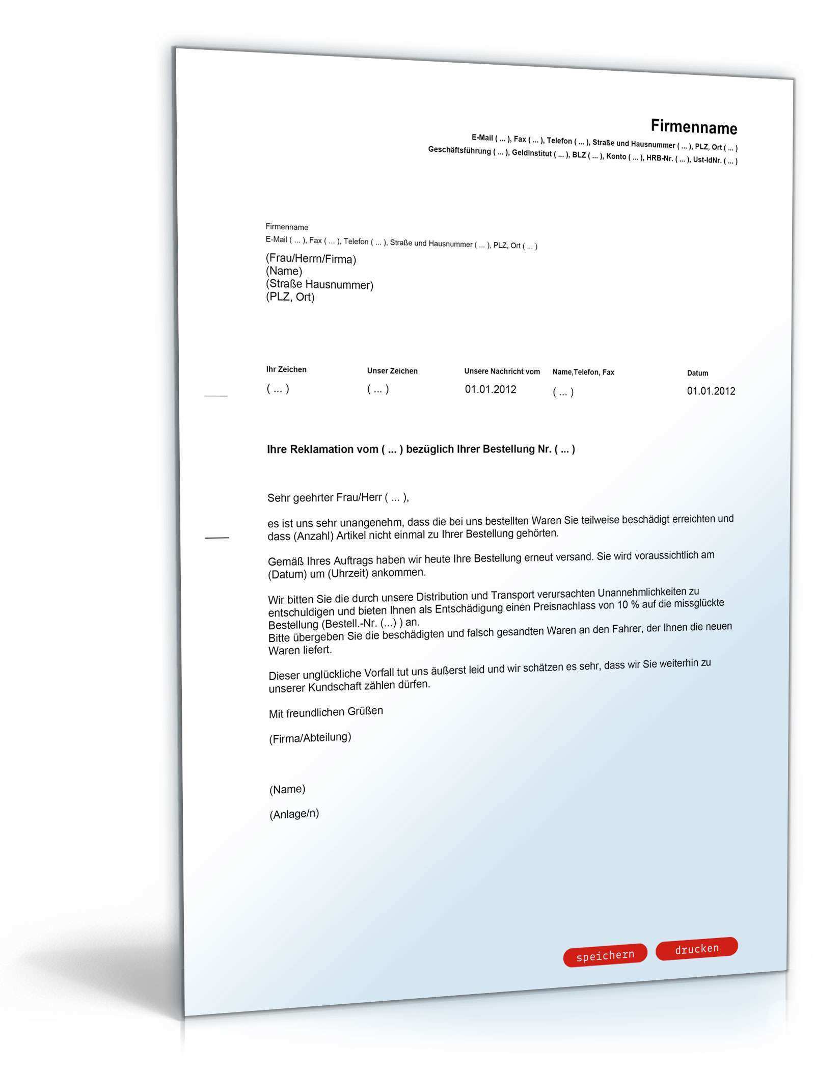 Reklamation vorlage beschaedigte ware. Vorlagen und muster verschiedener reklamationen und beschwerden gratis und kostenlos zum runterladen. Michaela muster musterweg 1 99999 musterstadt an unternehmen geschäft händler datum bestellung kauf vom vertrags antrags bestellnummer kaufbeleg sehr geehrte damen und herren am datum einfügen haben sie mir ware einfügen z. Die rechte des käufers bei mängeln sind in 437 bgb geregelt. Mit dieser vorlage kann ein reklamationsschreiben erstellt werden.