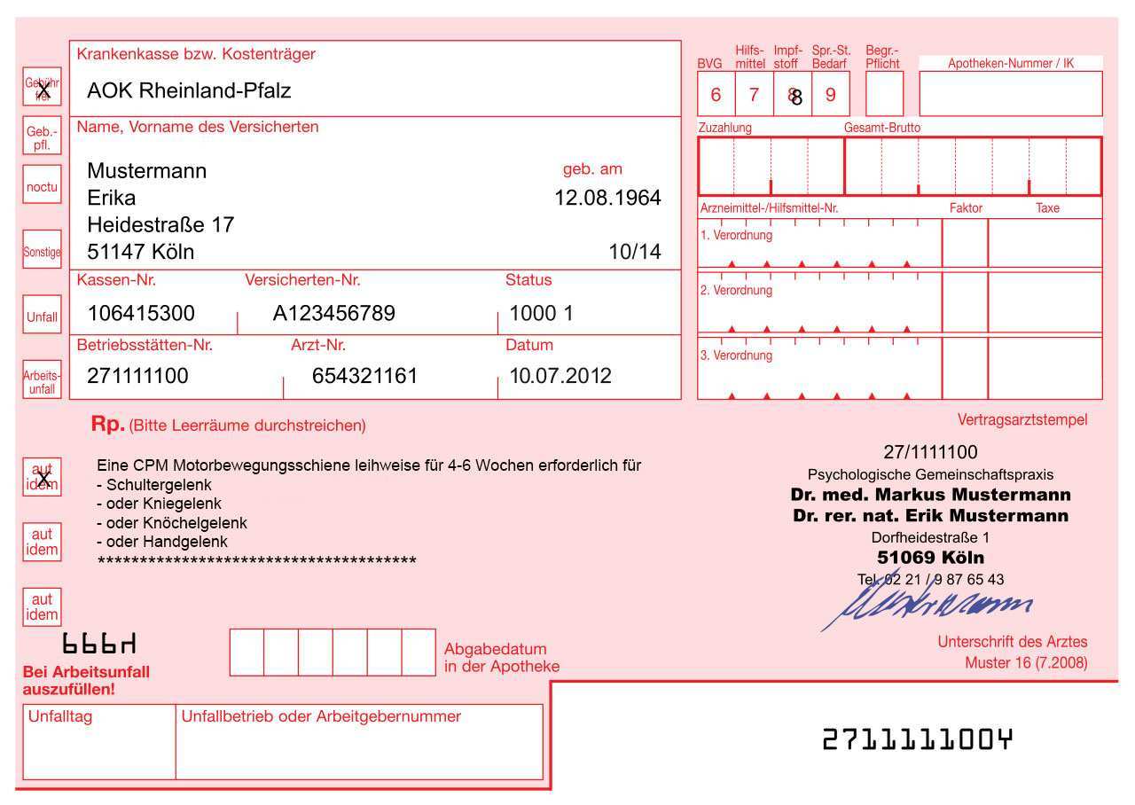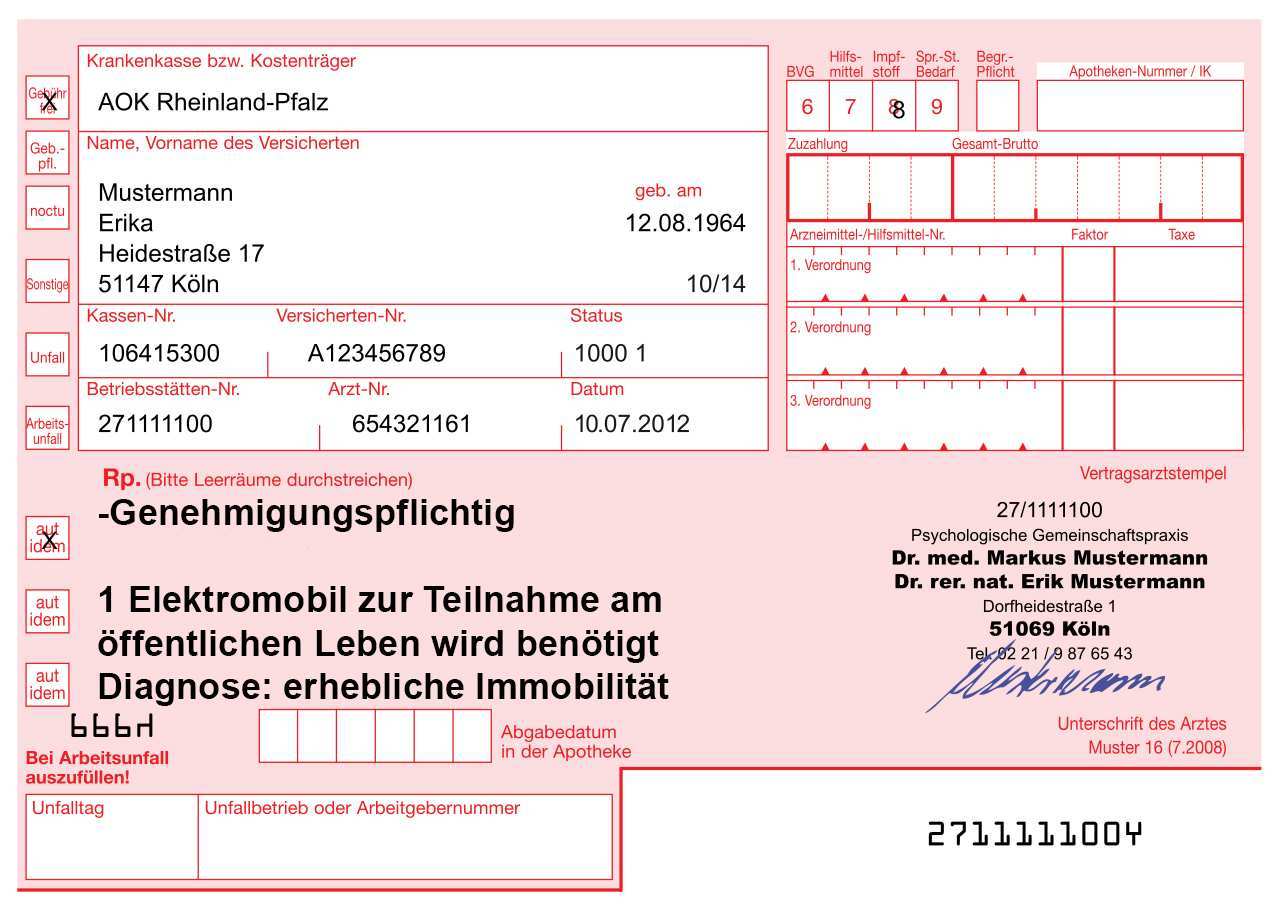 Rollstuhl rezept muster e. Die verordnung von hilfsmittelerfolgt auf muster 16unter ankreuzen des feldes 7. Aber auch wenn man einen aktiv rollstuhl bekommt muß man auf einiges achten. Sollten sie eine verordnung für ein hilfsmittel rollator pflegebett rollstuhl usw oder verbrauchsmaterial von ihrem arzt erhalten haben können sie dieses rezept gerne über unser sanitätshaus einreichen sofern sie in unserem liefergebiet wohnen wir nehmen dann die rezeptabwicklung oder verrechnung mit ihrer krankenkasse vor.
