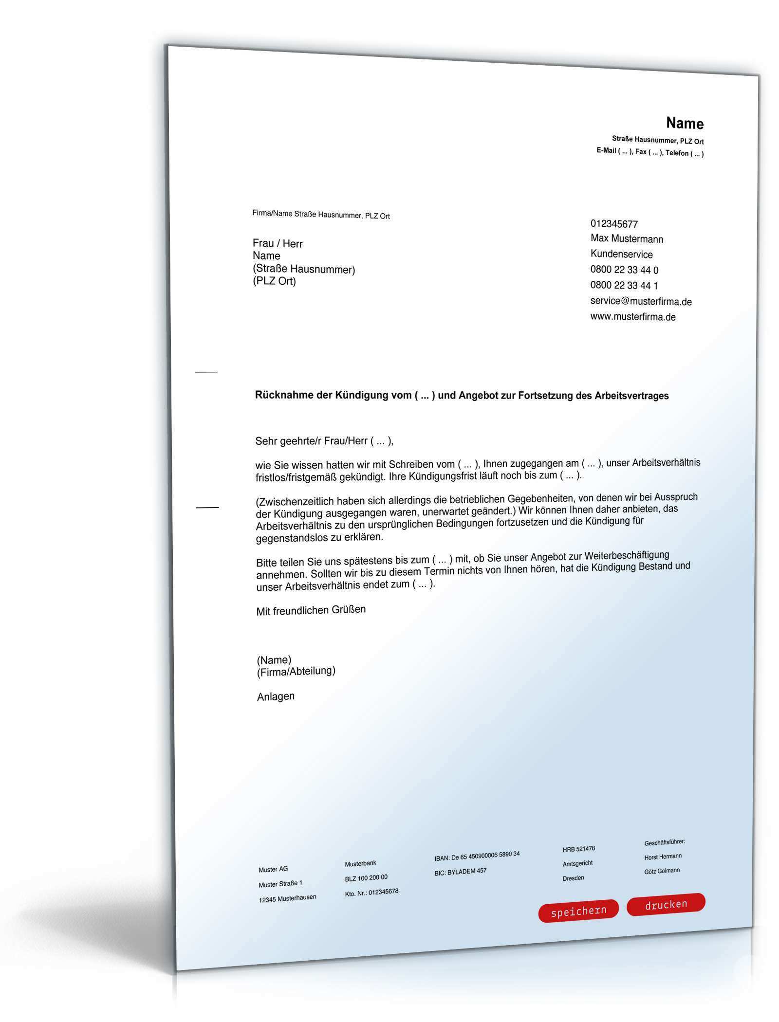 Ruecknahme Kuendigung Muster