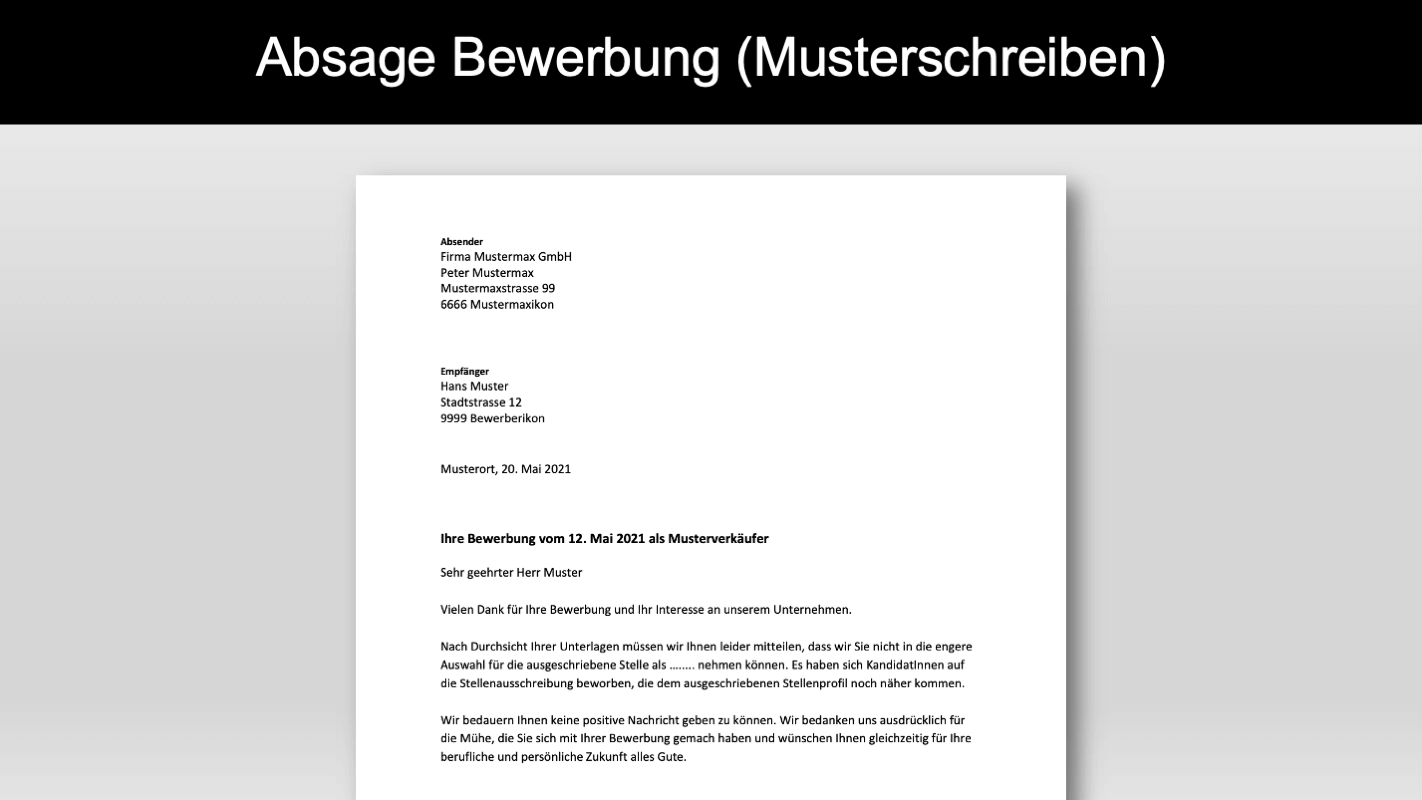 Absage zur bewerbung muster 2. Sehr geehrter herr muster name wir danken ihnen für die übersendung ihrer bewerbungsunterlagen und das unserem unternehmen entgegengebrachte interesse. Sehr geehrte herr frau mustermann sie haben sich bei uns auf eine ausbildungsstelle arbeitsstelle beworben. Leider müssen wir ihnen mitteilen dass die prüfung einer einstellmöglichkeit für sie in unserem hause erfolglos verlief.