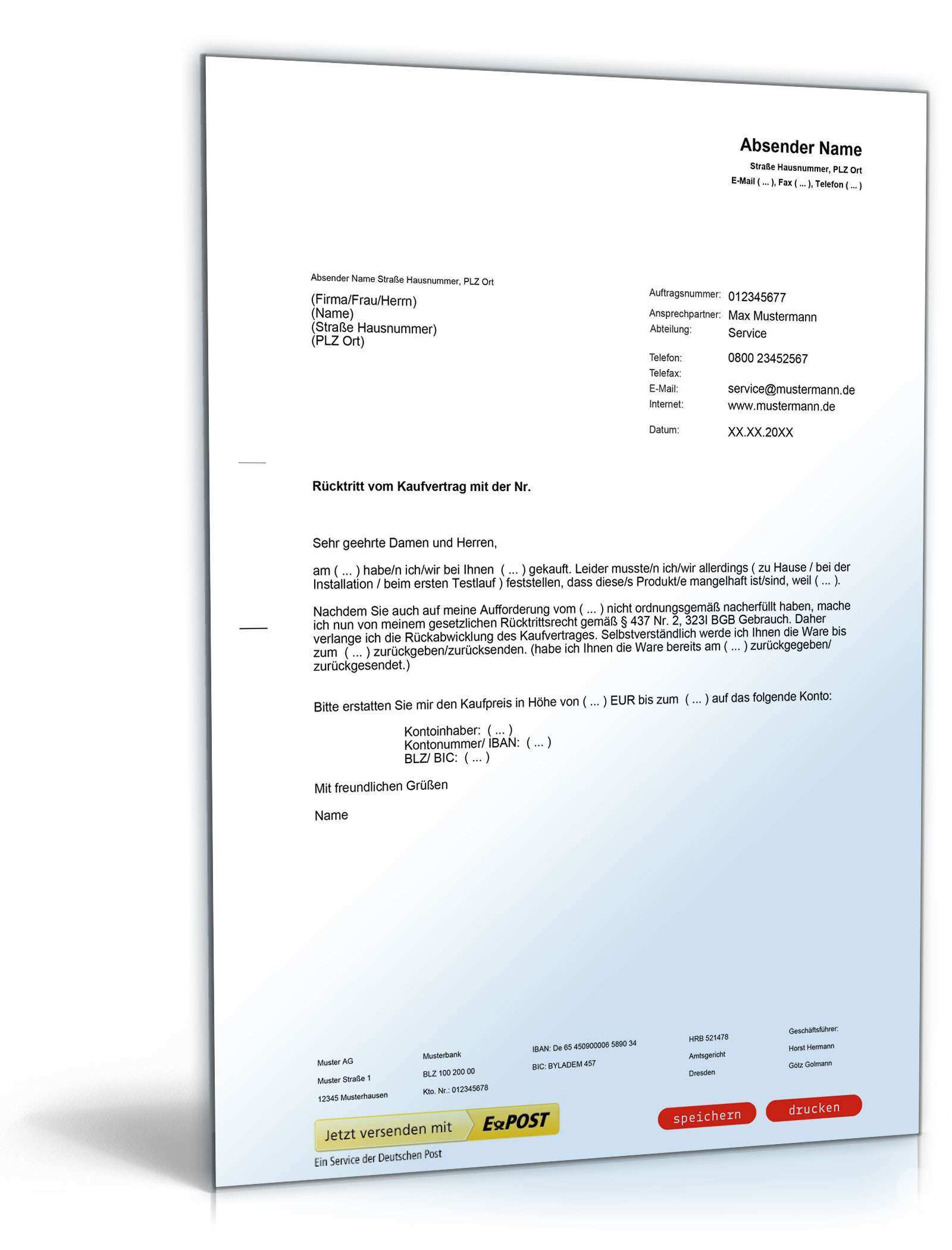 Michaela muster musterweg 1 99999 musterstadt an unternehmen geschäft händler datum bestellung kauf vom vertrags antrags bestellnummer kaufbeleg sehr geehrte damen und herren am. Diese verpflichtung ergibt sich nach einem wirksamen rücktritt vom kaufvertrag aus dem rückgewährschuldverhältnis 346 bgb so rechtsexperte frischhut. Sobald sie den vertrag unterschrieben haben gestaltet sich ein rücktritt deutlich komplizierter. Dabei kommt es vor allem darauf an was für den fall eines rücktritts im vertrag vereinbart wurde.