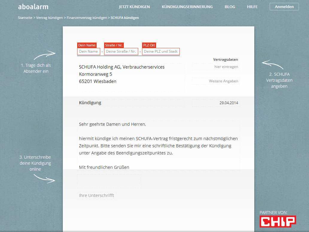 Erstellen sie eine meine schufa kündigung mit hilfe unserer muster vorlage schnell und einfach in wenigen minuten ohne anmeldung. Wenn sie ihren schufa updateservice vertrag oder andere schufa produkte kündigen möchten dann greifen sie am besten zur schufa kündigen vorlage. Wenn sie ihr schufa abo fristgerecht kündigen möchten ist dies in der regel mit einer frist von einem monat zum vertragsende möglich. Sehr geehrte damen und herren hiermit kündige ich meinen vertrag mit ihnen fristlos.