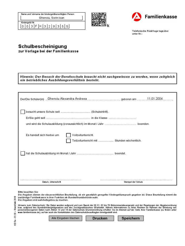 Zur vorlage bei der familienkasse. Name und vorname des der kindergeldberechtigten kindergeldnummer schulbescheinigung zur vorlage bei der familienkasse der besuch der berufsschule braucht nicht nachgewiesen zu werden der die schüler in name vorname. Download pdf merkblatt kindergeld auf rumänisch broșura informativă alocație pentru copii 0 3 mb antrag auf kindergeld rumänisch kg 1 ro. Schulbescheinigung zur vorlage bei der familienkasse hinweis.