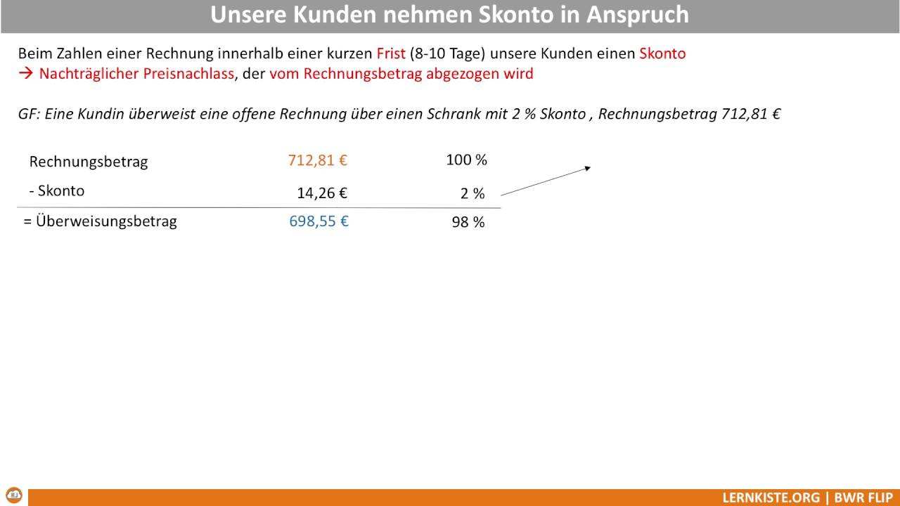 Zahlung innerhalb von 14 tagen abzüglich eines skontos von 2 30 tage netto. Bei bezahlung der rechnung innerhalb einer angegebenen frist darf sich der kunde einen bestimmten prozentsatz vom rechnungsbetrag abziehen. Rechnungssumme prozentsatz skonto skontobetrag. Wie bereits oben gezeigt ergibt sich bei einem betrag von 5 000 ein rechnungsbetrag abzüglich skonto von 4 850.