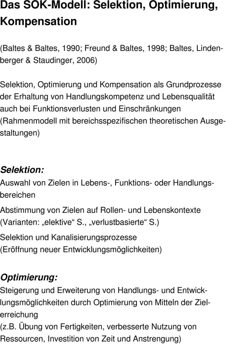 Selektion optimierung kompensation baltes baltes 1990. Antwort hinzufügen baltes und baltes erschufen sok modell zur wahl und verfolgung von zielen selektion optimierung und kompensation erfolgreiche. Das sok modell führt drei zentrale entwicklungsprozesse ein die über die gesamte lebensspanne hinweg wirken selektion kompensation und optimierung. Zu beginn der 90er jahre hatte paul baltes in seinen überlegungen zum erfolgreichen altern das sok modell vorgestellt bestehend aus selektion optimierung und kompensation und es am beispiel des pianisten arthur rubinstein erklärt.