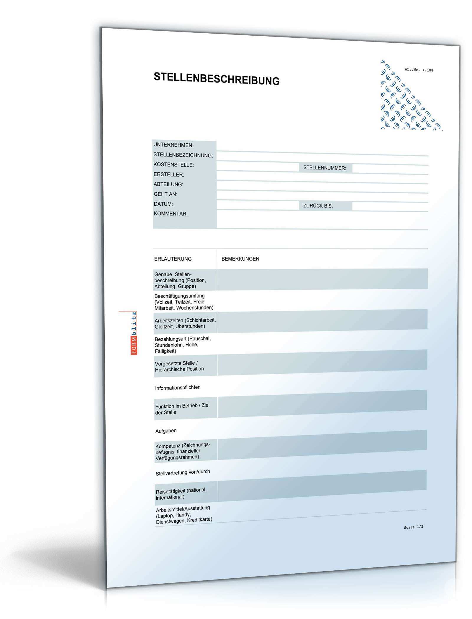 Die muster stellenbeschreibung enthält elemente die von ihnen verändert bzw. Suchen sie im musterschreiben nach diesen stichwörtern bzw. Muster einer stellenbeschreibung bezeichnung der stelle position vorgesetzter der stelleninhaber wird vertreten der stelleninhaber vertritt datum unterschrift stelleninhaber weiterleitung von folgenden informationen weisungsbefugt gegenüber qualifikation des stelleninhabers tätigkeiten im einzelnen aufgaben der stelle in kurzform. Datum 1 6 funktionsbezeichnung abteilungsleiter 1 7 bes.