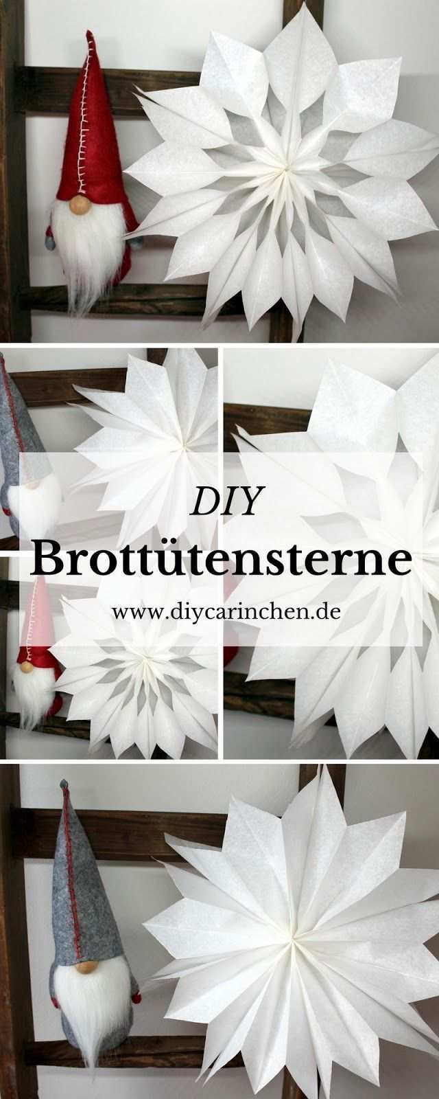 Viel braucht man dafür nicht. Ich habe meine sterne paarweise ins fenster gehängt und erfreue mich jeden tag an dem anblick. Mit stanzen oder eingeschnittenen mustern kannst du ganz individuelle modelle erschaffen. Basteln sie möglichst viele sterne aus brottüten und hängen die fertigen elemente mit elegantem geschenkpapier oder garn an der decke im wohn oder schlafzimmer auf.