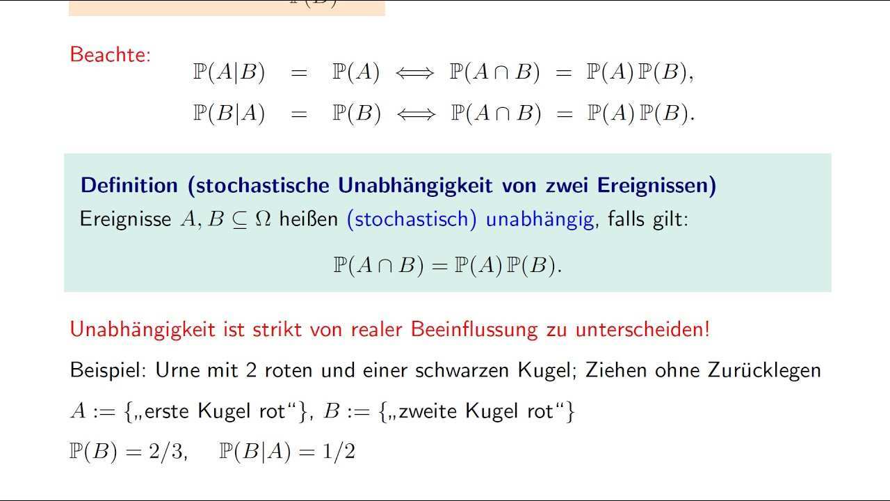 P b 1 p b 1 0 6 0 4 p b 1 p b 1 0 6 0 4 p a p a b p b 0 12 0 4 0 3 p a p a b p b 0 12 0 4 0 3 p a 1 p a 1 0 3 0 7 p a 1 p a 1 0 3 0 7. Die beiden ereignisse sind also stochastisch abhängig denn die wahrscheinlichkeit dass man eine blaue kugel zieht ist abhängig davon welche kugel zuvor gezogen wurde. Bei zufallsexperimenten mit stochastischer abhängigkeit ändern sich die wahrscheinlichkeiten nach jedem durchgang. Würfelwurf bisher wurde die stochastische unabhängigkeit an mehrstufigen zufallsexperimenten vorgeführt.