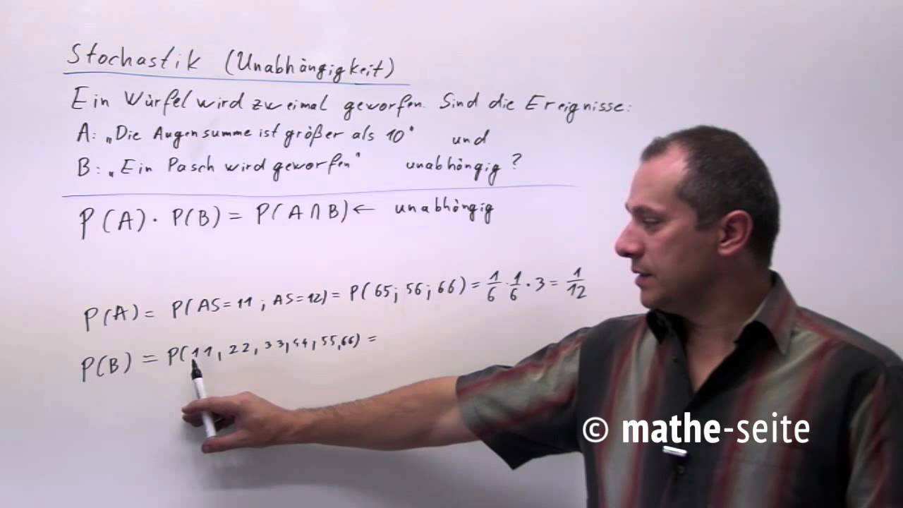Beispiele für stochastische unabhängigkeit. Beispiel für stochastisch unabhängig oder abhängig am fairen würfel hier gehts zu meiner mathe lernplattform inkl. Würfeln wenn man einmal gewürfelt hat ändert dies ja nicht die wahrscheinlichkeit beim nächsten würfeln. Jetzt sollst du bestimmen ob die ereignisse a und b voneinander abhängig oder unabhängig sind.