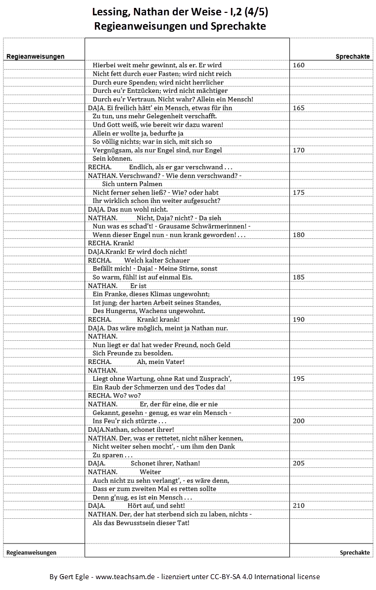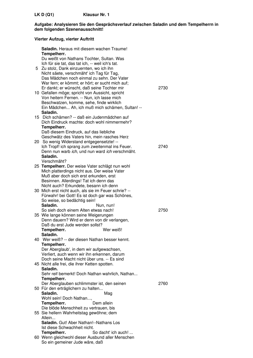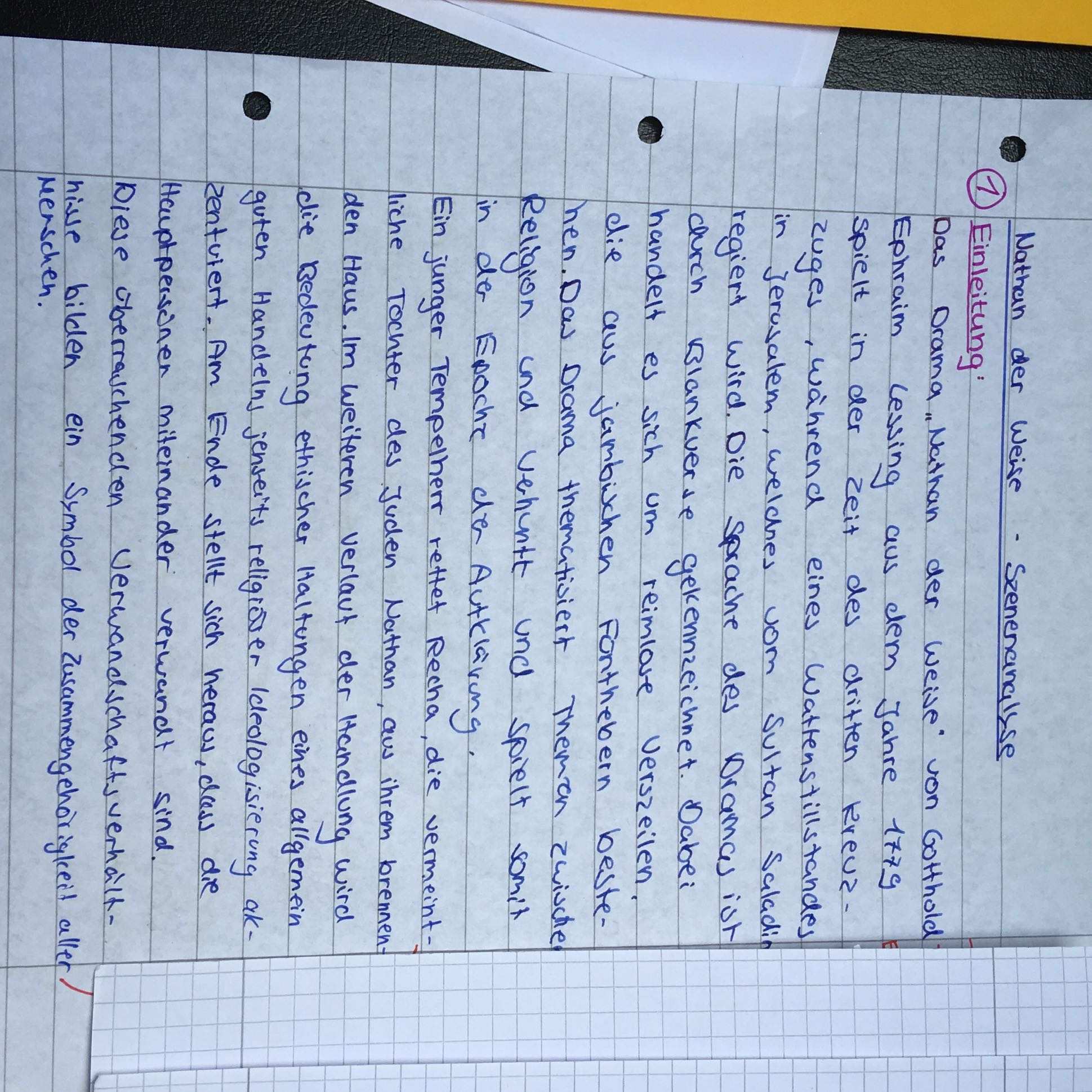 Szenenanalyse beispiel nathan der weise. Im leistungskurs kann man noch eine ausführlichere hinführung zur szenenanalyse schreiben die mehr auf die epochen und die entstehungsumstände des bürgerlichen trauerspiels eingeht. Während eines waffenstillstandes in jerusalem spielt geht es um den kampf zwischen den drei weltreligionen und die benötigte toleranz und humanität die für die versöhnung benötigt wird jedoch zunächst nicht von allen. Das drama nathan der weise von gotthold ephraim lessing aus dem jahre 1779 spielt in der zeit des dritten kreuzzuges während eines waffenstillstandes in jerusalem welches vom sultan saladin regiert wird. Gotthold ephraim lessing nathan der weise 2.