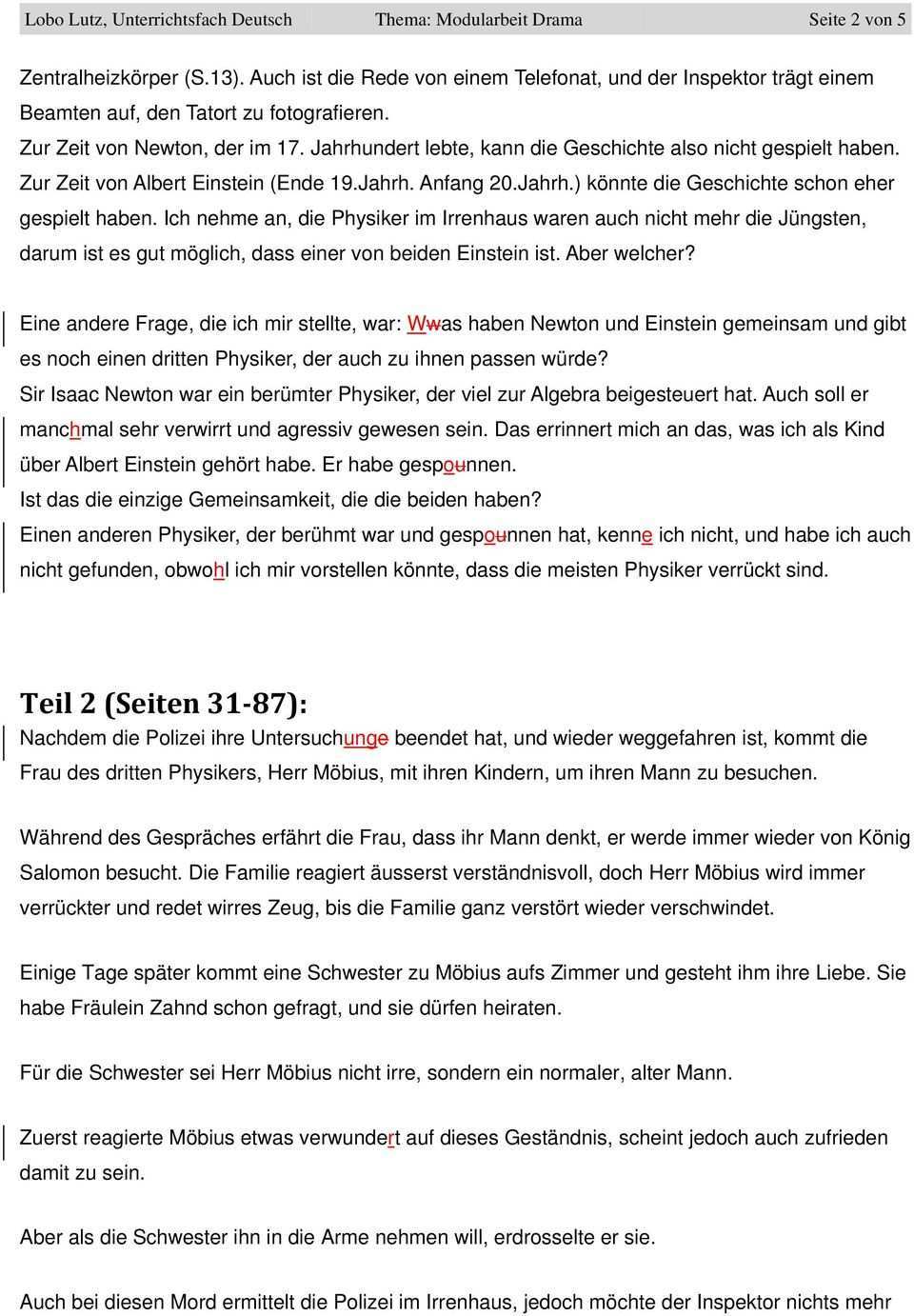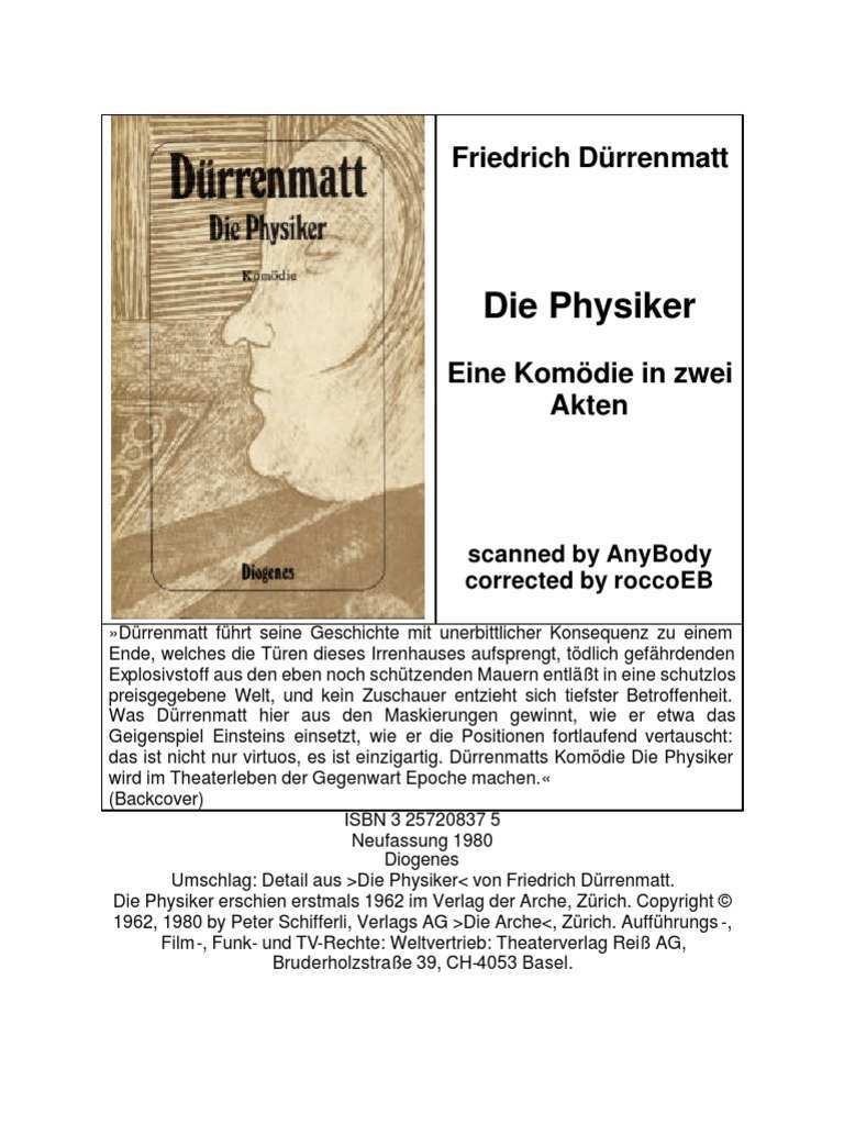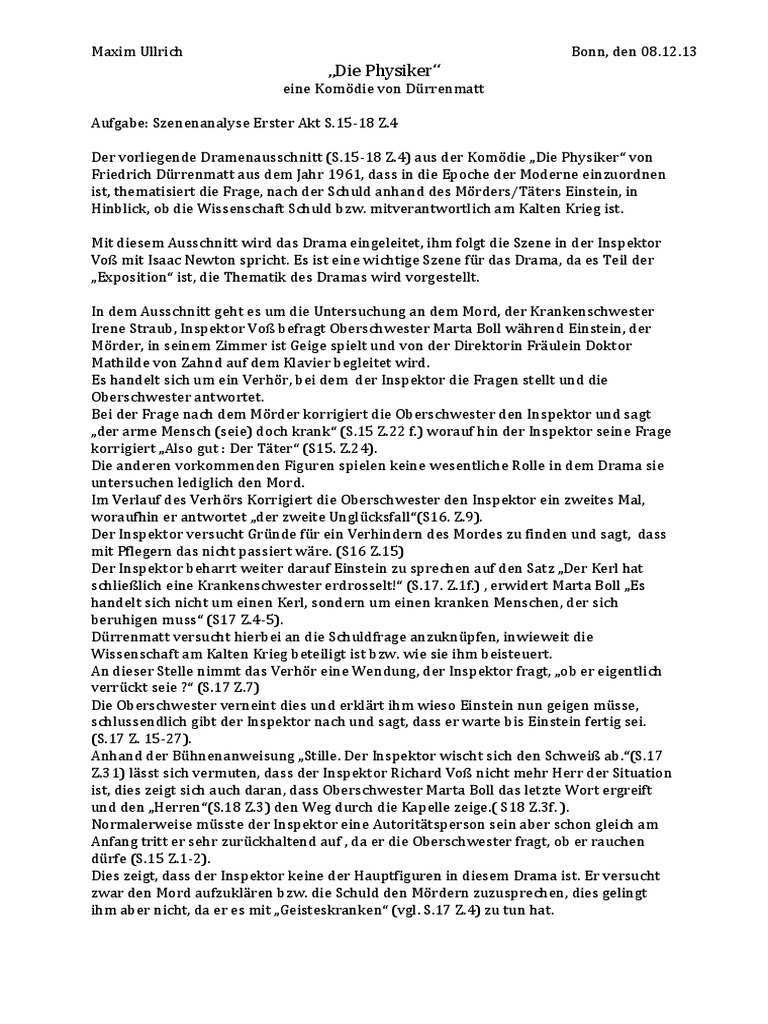 Und zum schluss fässt du das alles nochmal in deinen eigenen worten zusammen was anhand dieser stelle deutlich wird. Zum schluss ist es ja so dass sich die physiker langsam aber sicher einig werden dass sie alle in dem irrenhaus bleiben. Szenenanalyse erster akt s 15 18 z 4 der vorliegende dramenausschnitt s 15 18 z 4 aus der komdie die physiker von friedrich drrenmatt aus dem jahr 1961 dass in die epoche der moderne einzuordnen ist thematisiert die frage nach der schuld anhand des mrders tters einstein in hinblick ob die wissenschaft. Friedrich dürrenmatt die physiker 2.
