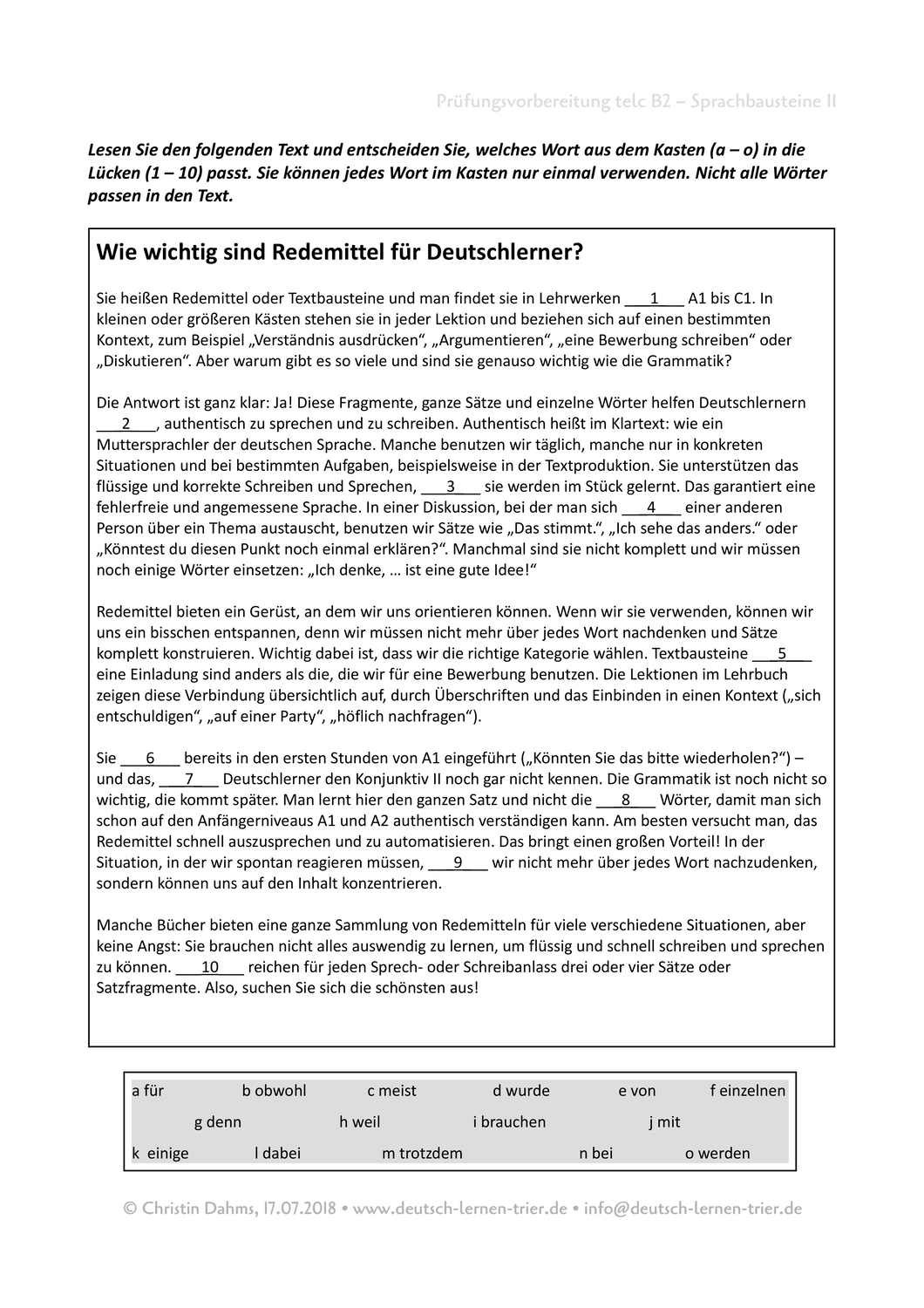 Zum beispiel gewitter und stürme nur schwer vorhersagen. übungstest telc deutsch b2 mit dem übungstest telc deutsch b2 können sie auspro bieren ob sie das niveau b2 schon erreicht haben. Sie können den test wie eine richtige prüfung ablegen. Share embed telc deutsch b2 modelltest please copy and paste this embed script to where you want to embed.
