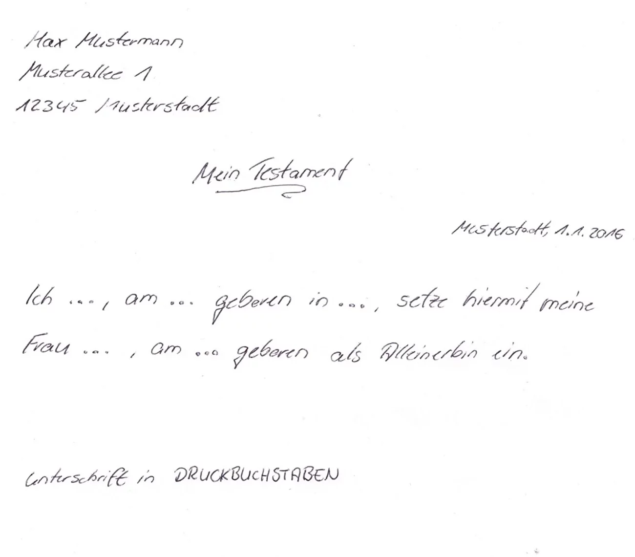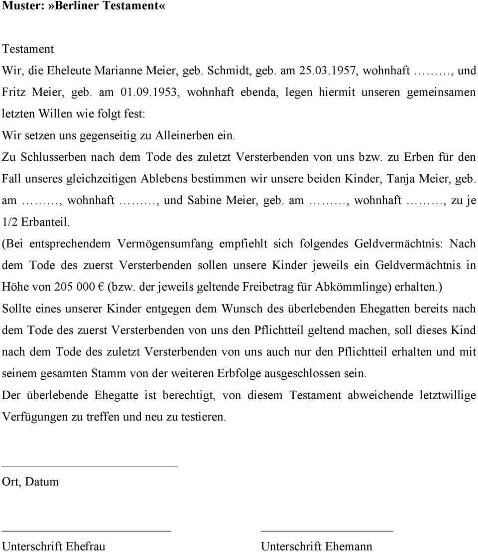 Testament nichteheliche lebensgemeinschaft muster. Testament nichteheliche lebensgemeinschaft muster überarbeitet am. Testament nichteheliche lebensgemeinschaft paaren die weder in einer ehe noch in einer eingetragenen lebenspartnerschaft zusammen leben entstehen hierdurch vor allem in erbrechtlicher hinsicht nicht unwesentliche nachteile. Nichteheliche lebenspartner werden auch bei der erbschaftsteuer benachteiligt. Muster ehegattentestament mit vermächtnis zugunsten des ehegatten der erstversterbende von uns setzt zu seinen erben unsere abkömmlinge zu gleichen teilen ein.
