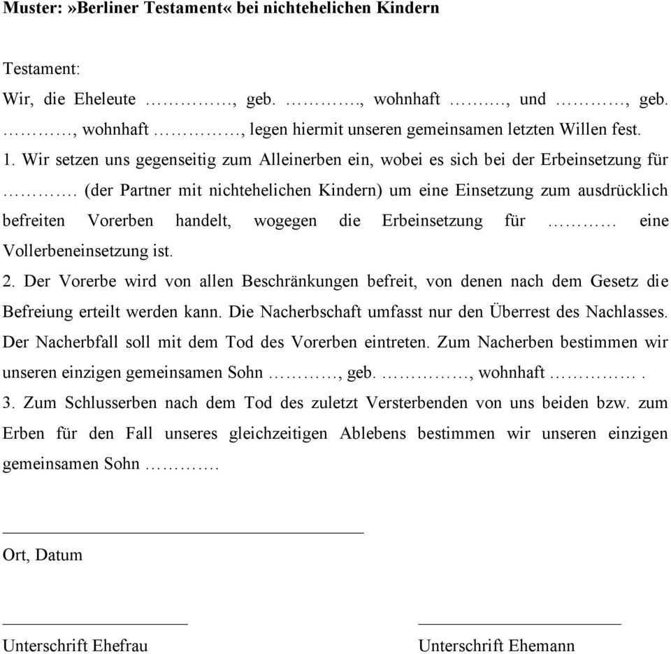 Testament unverheirateten partnern muster. Testament unverheirateten partnern muster posted on august 11 2020 by dinkoslav darüber hinaus kann es bei einigen rentensystemen zu komplikationen kommen die im todesfall an unverheiratete partner ausgezahlt werden insbesondere wenn es um betriebliche systeme geht. Nichteheliche lebensgefährten haben überhaupt kein gesetzliches erb oder pflichtteilsrecht beim tod des partners. Theoretisch könnte einer von ihnen hinter dem rücken des anderen später heimlich sein testament ändern und jemand anderen zum erben einsetzen. Das gilt auch dann wenn die lebensgemeinschaft auf dauer bestanden hat den charakter einer ehe angenommen und der überlebende seinen partner intensiv über jahre hinweg gepflegt und in dieser zeit kein eigenes einkommen erzielt hat.