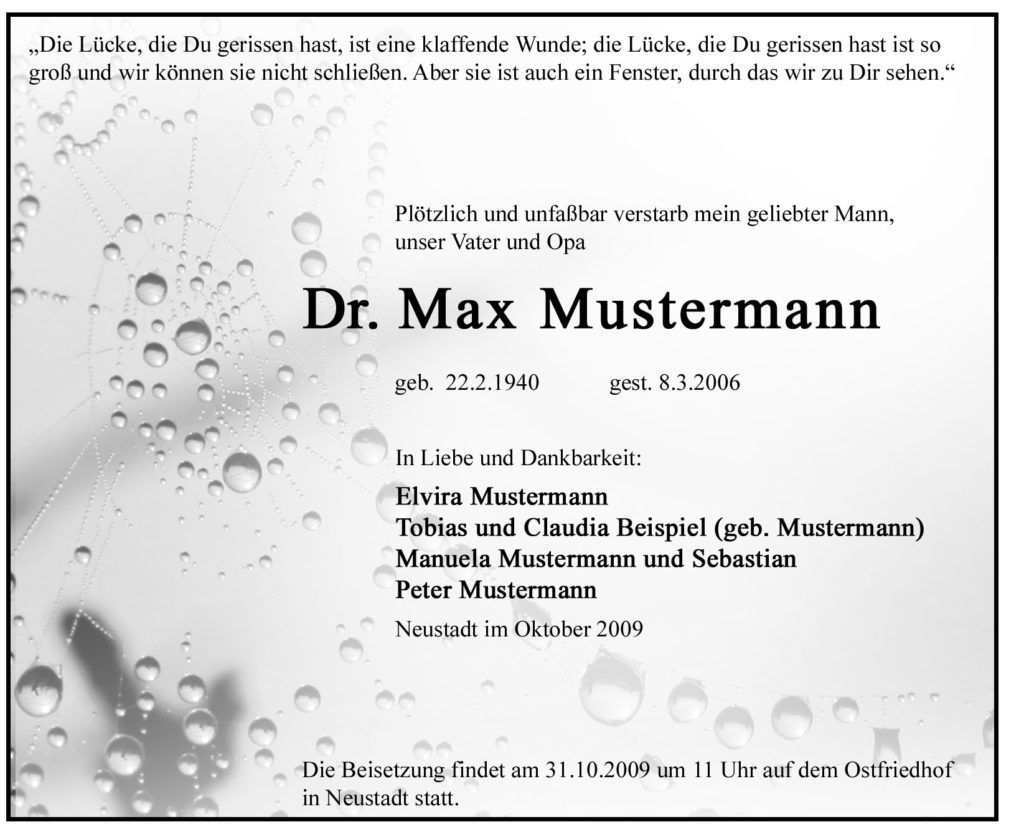 Finden sie hier muster und vorlagen für traueranzeigen. 7 95 euro 128 seiten duden verlag. Selbstverständlich erstelle ich ihnen die traueranzeige in den formaten ihrer tageszeitung. Denn wir bieten ihnen eine vielfältige auswahl an todesanzeigen vorlagen.