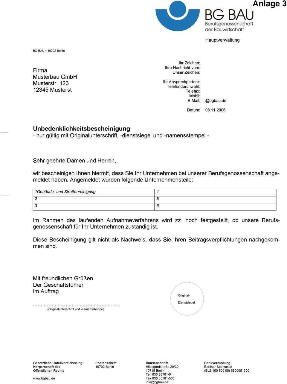 Die unbedenklichkeitsbescheinigung fur die anmeldung neu gegrundete unternehmen die sich bei der bg bau anmelden und kurzfristig eine bestati gung hieruber benotigen erhalten eine anmelde unbedenklichkeitsbescheinigung.
