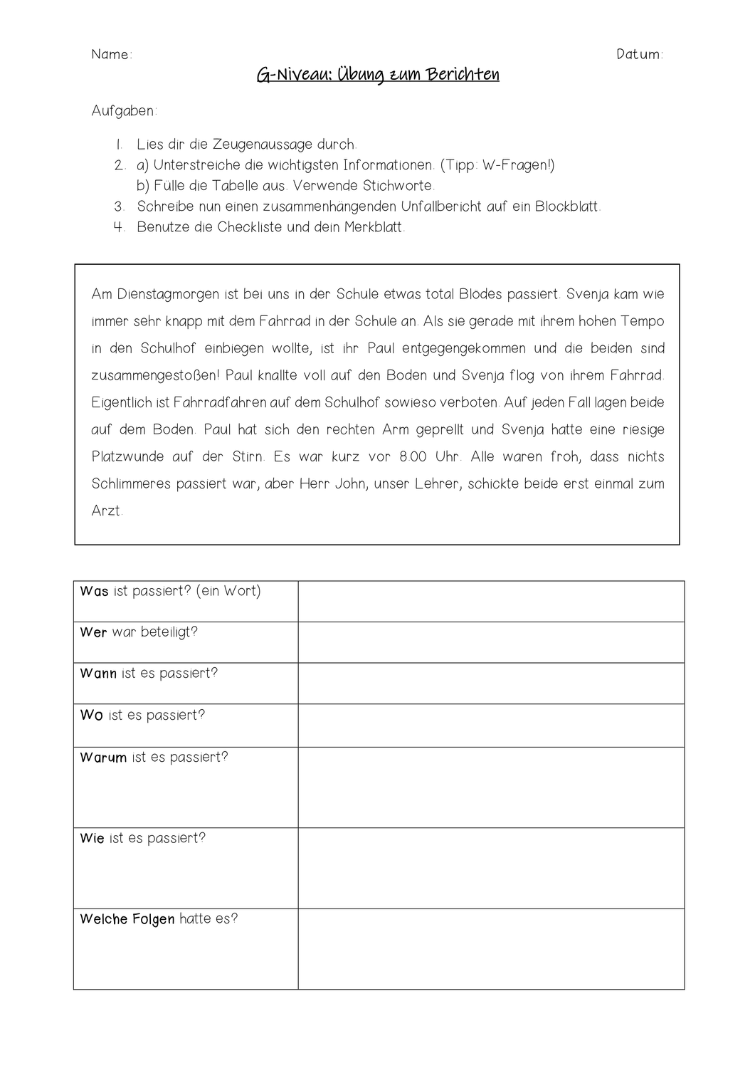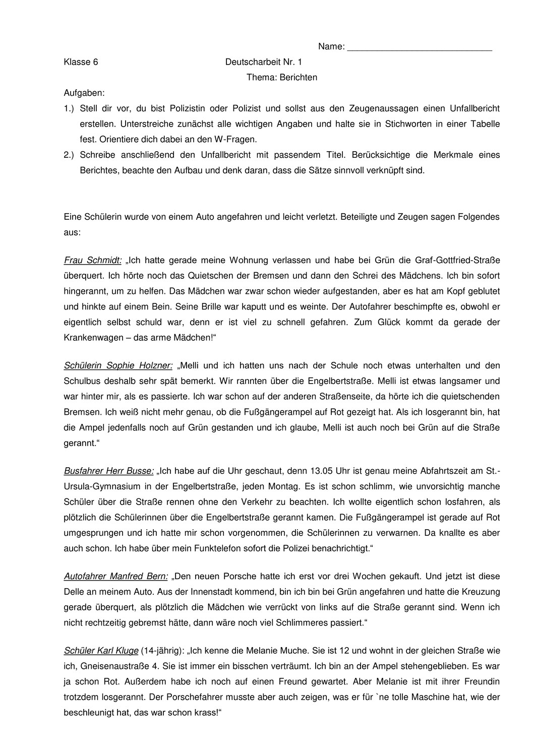 Obwohl diese immer wieder nicht ganz neutral sind geben sie ganz allgemein eine gute orientierung. Klassenarbeiten mit musterlösung zum thema unfallbericht aufsatz. Die verwendete zeitform bei einem unfallbericht. Alle in dieser rangliste beschriebenen muster unfallbericht 6 klasse sind unmittelbar in unserem partnershop im lager verfügbar und somit in maximal 2 tagen vor ihrer haustür.