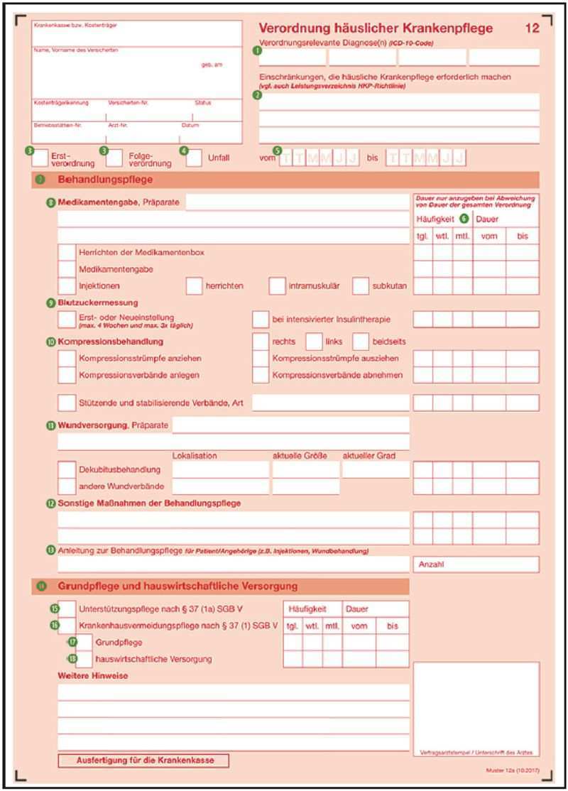 Oktober 2020 gibt es ein neues formular zur verordnung häuslicher krankenpflege muster 12 aufgrund von neuerungen zur wundversorgung. Kostenträger freigabe 12 03 2008 t tmmj jt tmmj j t tmmj jt tmmj j muster 1a 1b 4a 3 2 1c 1b. Tipps zum ausfüllen der verordnung häuslicher krankenpflege stand oktober 2017 voraussetzung für die verordnung ist dass sich der vertragsarzt die vertragsärztin vom zustand des patienten und der notwendigkeit häuslicher krankenpflege persönlich überzeugt hat oder dass ihm ihr beides aus der laufenden behandlung bekannt ist. Oktober gilt verbindlich das neue verordnungformular muster 12 für die häusliche.