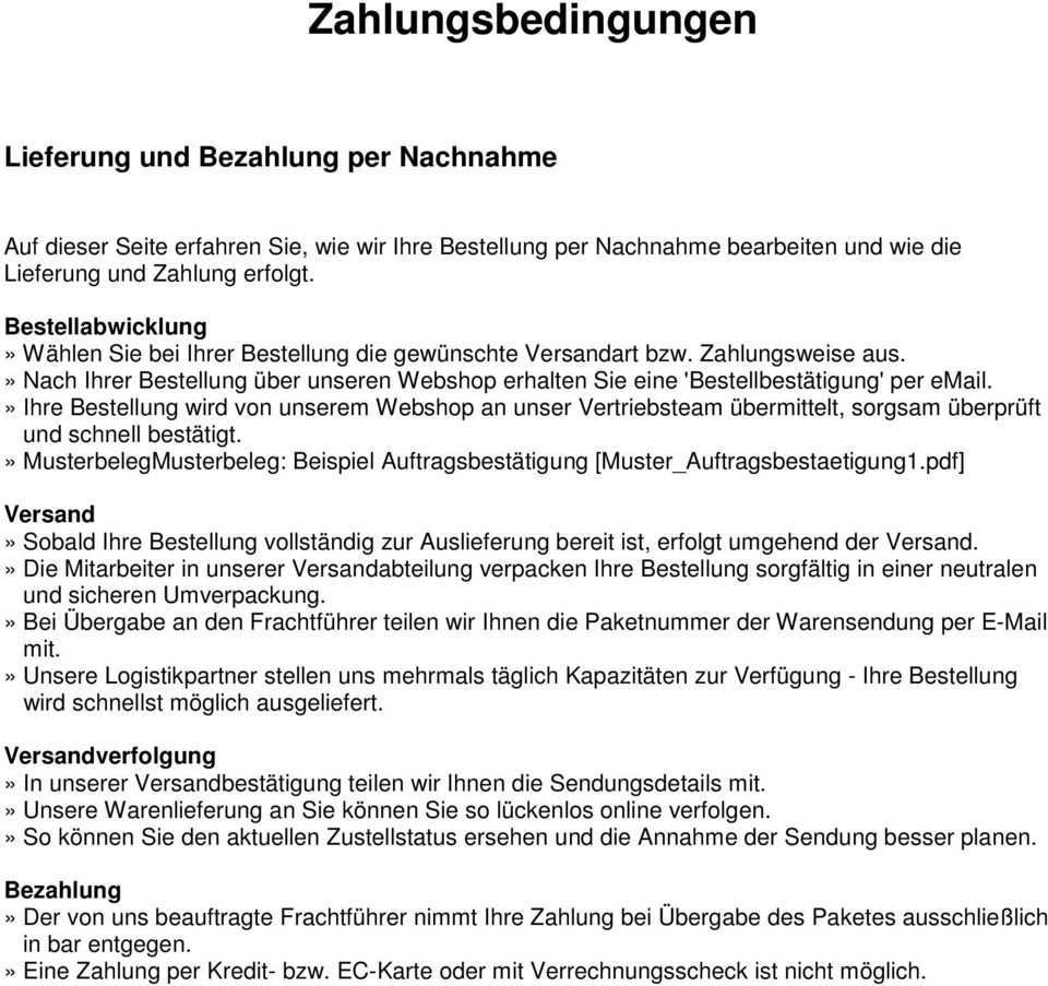 Alle an den artikeln angegebenen preise sind brutto bzw. Versand und zahlungsbedingungen preise und versandkosten 1 alle preise die auf der website des anbieters angegeben sind verstehen sich einschließlich der jeweils gültigen gesetzlichen umsatzsteuer. Die musterformulierungen für eine informationsseite zu versand zahlungsmöglichkeiten und berechnung der lieferzeit enthält zwei muster mit erläuterungen bearbeitungshinweisen und weiterführenden hintergrundinformationen. Nachnahmegebühr 20 00.