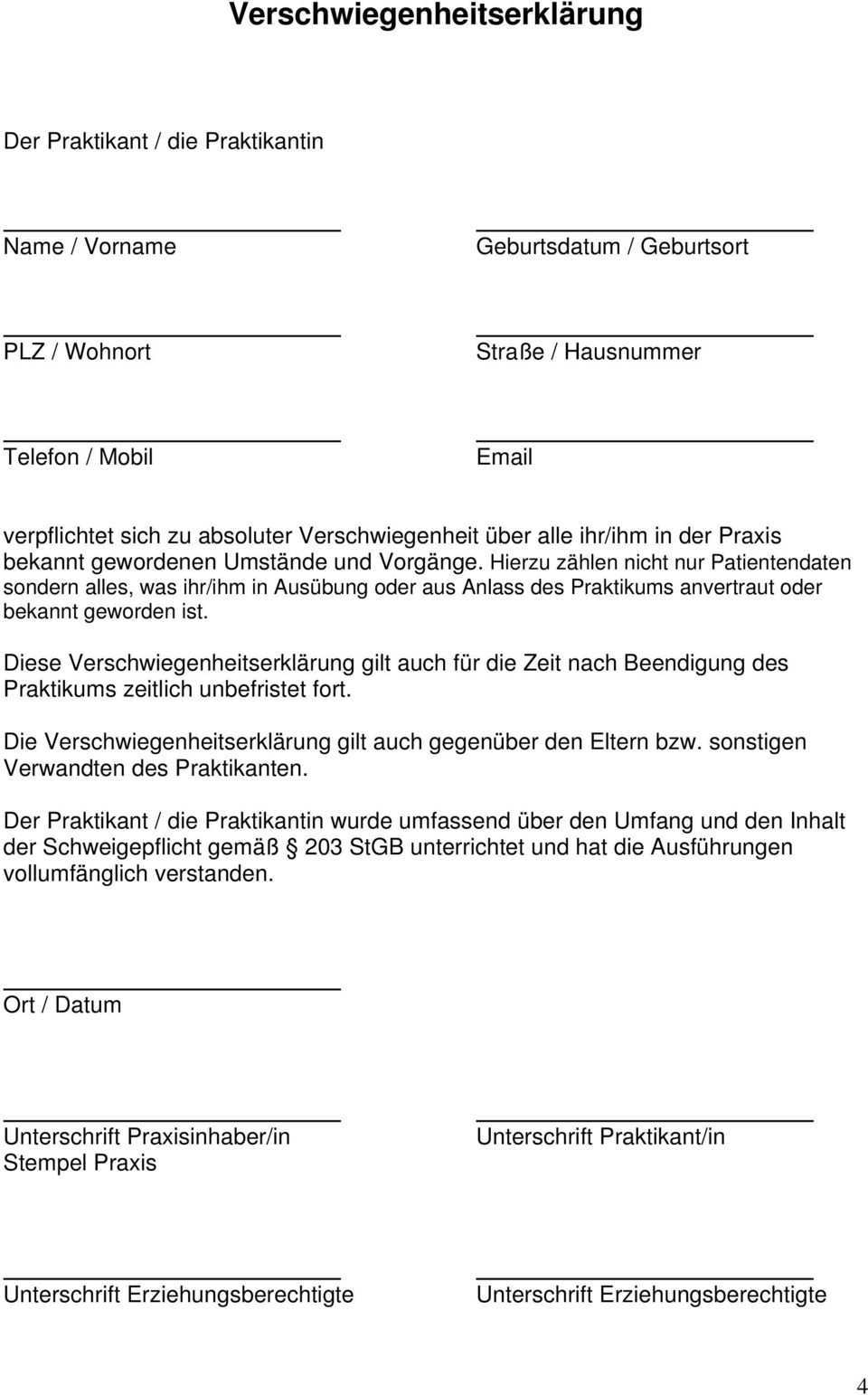 Von auszubildenden fachangestellten gehilfen praktikanten referendaren und sonstigen mitarbeitern bei rechtsanwälten ich bin heute von meinem arbeitgeber über den umfang meiner verschwiegenheitspflicht belehrt worden. Die schweigepflicht erstreckt sich auf sie als medizinstudent. Vor und nachname praktikantin praktikant. Mir sind die unten abgedruckten bestimmungen bekannt gegeben worden.