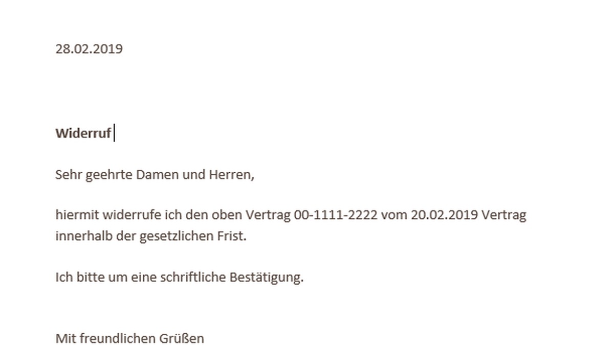 Vertrag widerruf nr sehr geehrte damen und herren hiermit möchte ich von meinem widerrufsrecht gebrauch machen und meinen vertrag vom datum innerhalb der gesetzlichen frist von 14 tagen gemäß 355 bgb widerrufen. Haben sie online einen vertrag abgeschlossen können sie diesen innerhalb von 14 tagen widerrufen. Bei manchen anbietern können sie ihren vertrag auch per telefon widerrufen wenngleich dies eher die ausnahme als die regel ist. Verbraucher müssen den unternehmer nachweislich darüber informieren dass sie den vertrag widerrufen.