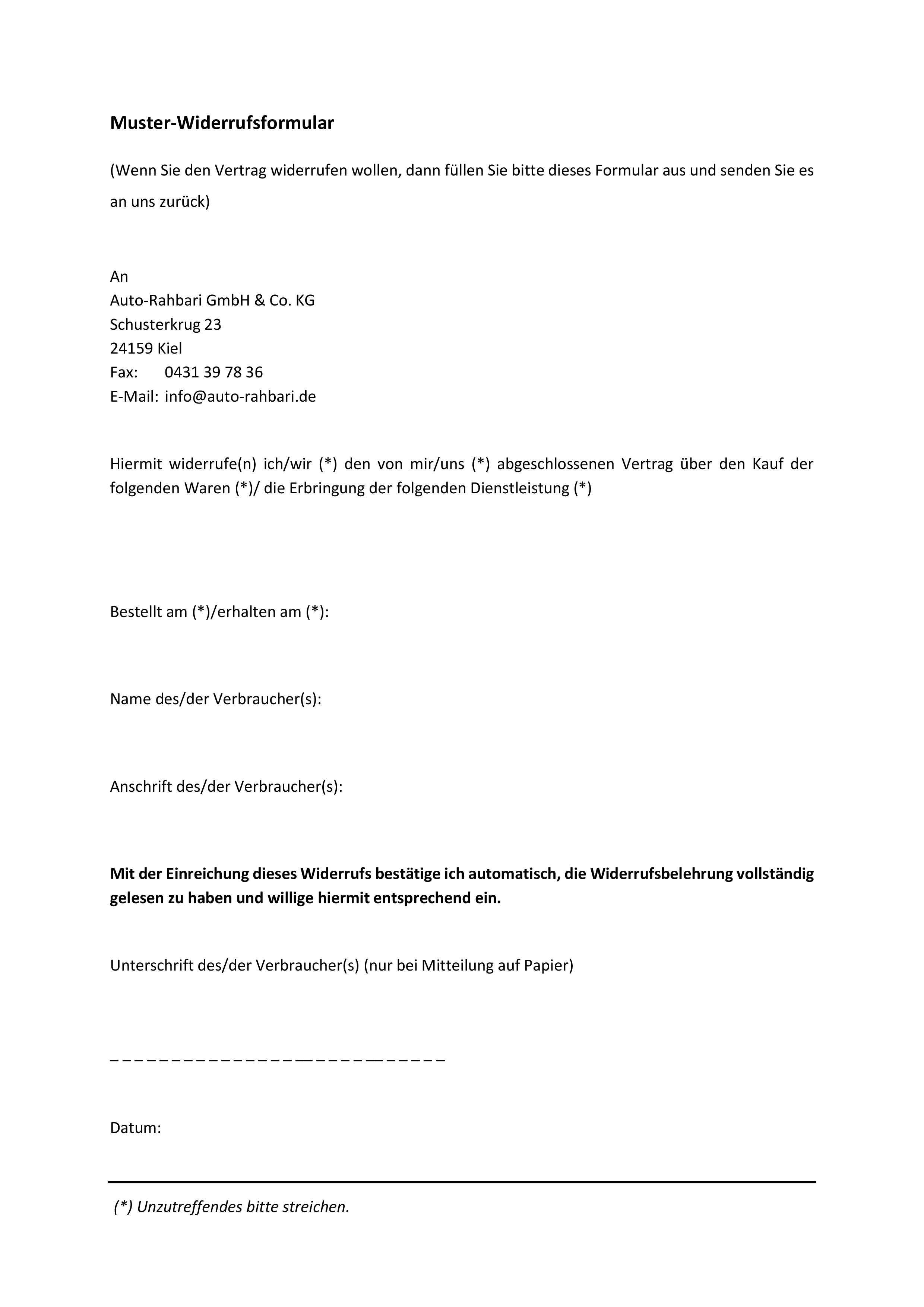 Das war bis mitte 2014 in ordnung doch mit der neuregelung des widerrufsrechts ist das hinfällig. Muster widerrufsformular wenn sie den vertrag widerrufen wollen dann füllen sie bitte dieses formular. Aus und senden sie es zurück an. Um ihren widerruf geltend zu machen müssen sie ihn schriftlich erklären.