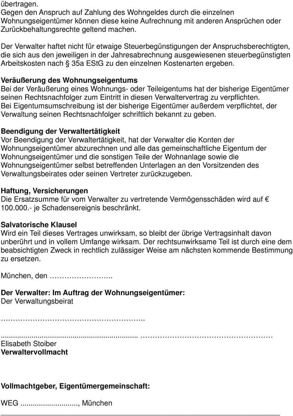 1 verwalterbestellung die firma wird als verwalter nach dem wohnungseigentumsgesetz für die liegenschaft bestellt. Ob das beim mietverwalter genauso ist wurde von den gerichten nicht entschieden. Sie ermächtigt nicht zur veräußerung und belastung und erwerb von grundbesitz. Die liegenschaft hat insgesamt wohn bzw.