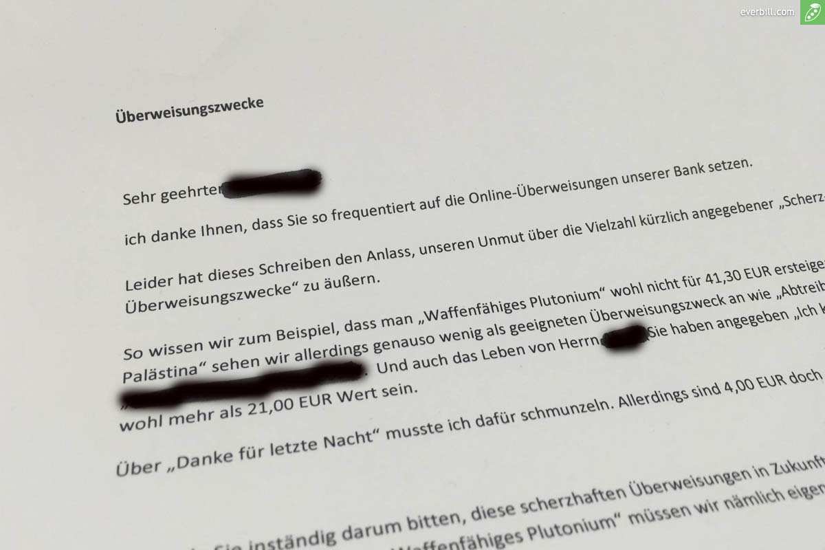 Wird zum beispiel an einen freund geld überwiesen dann bedarf es nicht extra eines verwendungszwecks. Die problematik bei firmen ist so dass sie täglich mehrere buchungen erhalten die in die hunderte gehen können. Wir haben ein paar ideen für erlaubte und dennoch lustige ausführungen. Beachten sie dass die überweisungen oft maschinell gelesen werden und sonderzeichen dann nicht erkannt werden können.