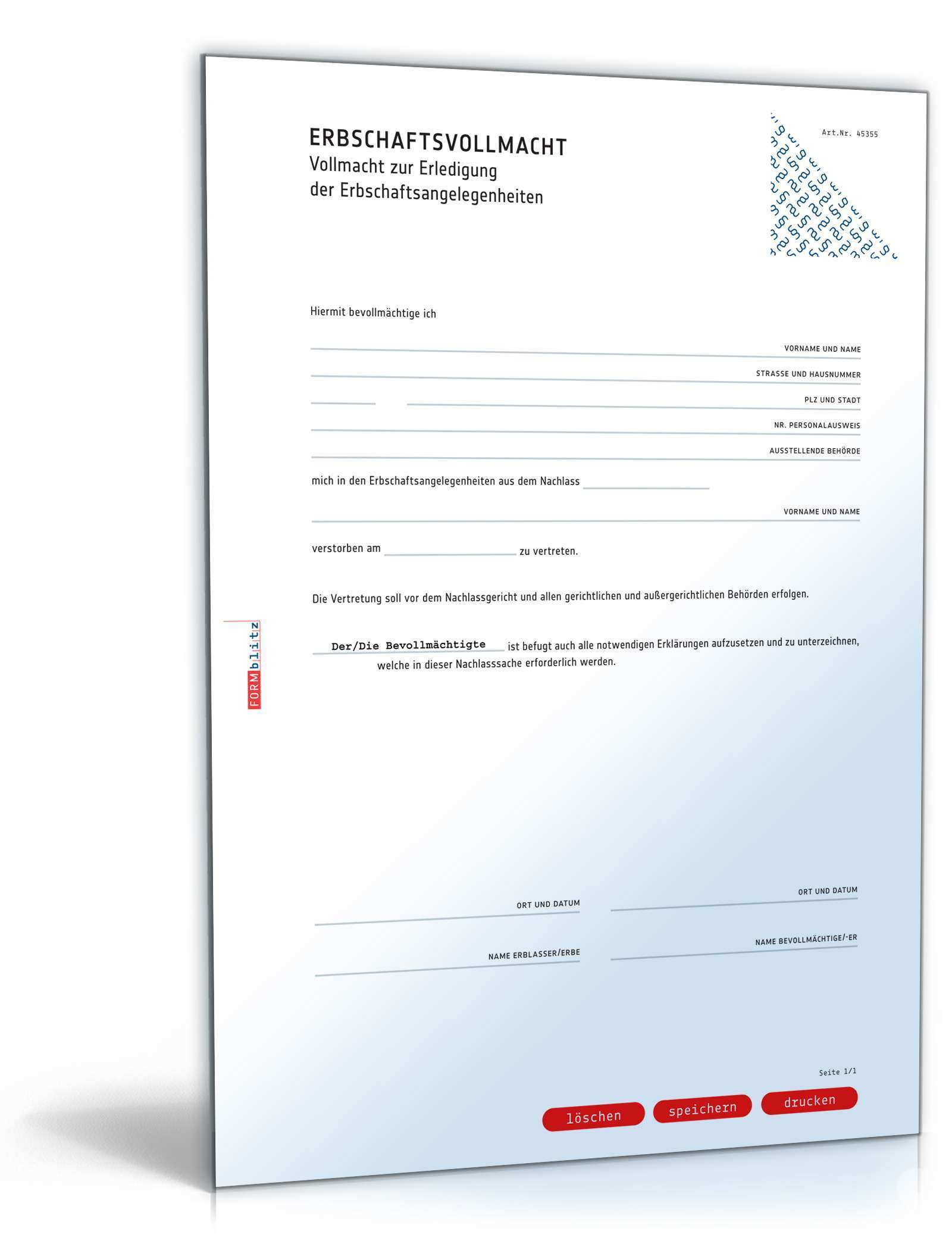 Mit einer vollmacht wird die nachlassabwicklung vielfach einfacher. Durch eine erteilte vollmacht der erbengemeinschaft können vielfach prozesse beschleunigt werden und die abwicklung des erbes kann in vielen fällen schneller von statten gehen. Mit dieser vorlage kann eine erbschaftsvollmacht erstellt werden eine erbschaftsvollmacht ermöglicht es sowohl dem erblasser als auch dem erben bezüglich der nachlassangelegenheiten einen anderen zu bevollmächtigen besonders geeignet ist diese vollmacht für größere erbengemeinschaften die weit auseinander wohnen. 3 erbauseinandersetzung vertrags muster für erbengemeinschaften 4 nachlassverzeichnis muster kann von pflichtteilsberechtigten gefordert werden 5 erbertrag muster achtung.