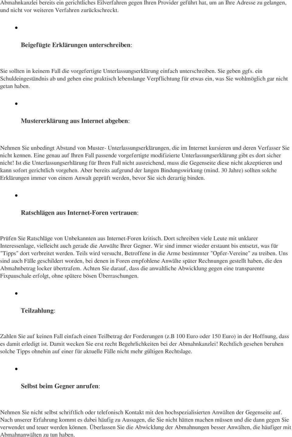Beispielstadt den 01 02 2017. Eine vorbeugende unterlassungserklärung weicht vom muster für die strafbewehrte version in der regel nicht ab. Ziffer 3 der muster unterlassungserklärung. Dies ist zum beispiel dann der fall wenn eine sogenannte kompilation in internettauschbörsen angeboten wurde.