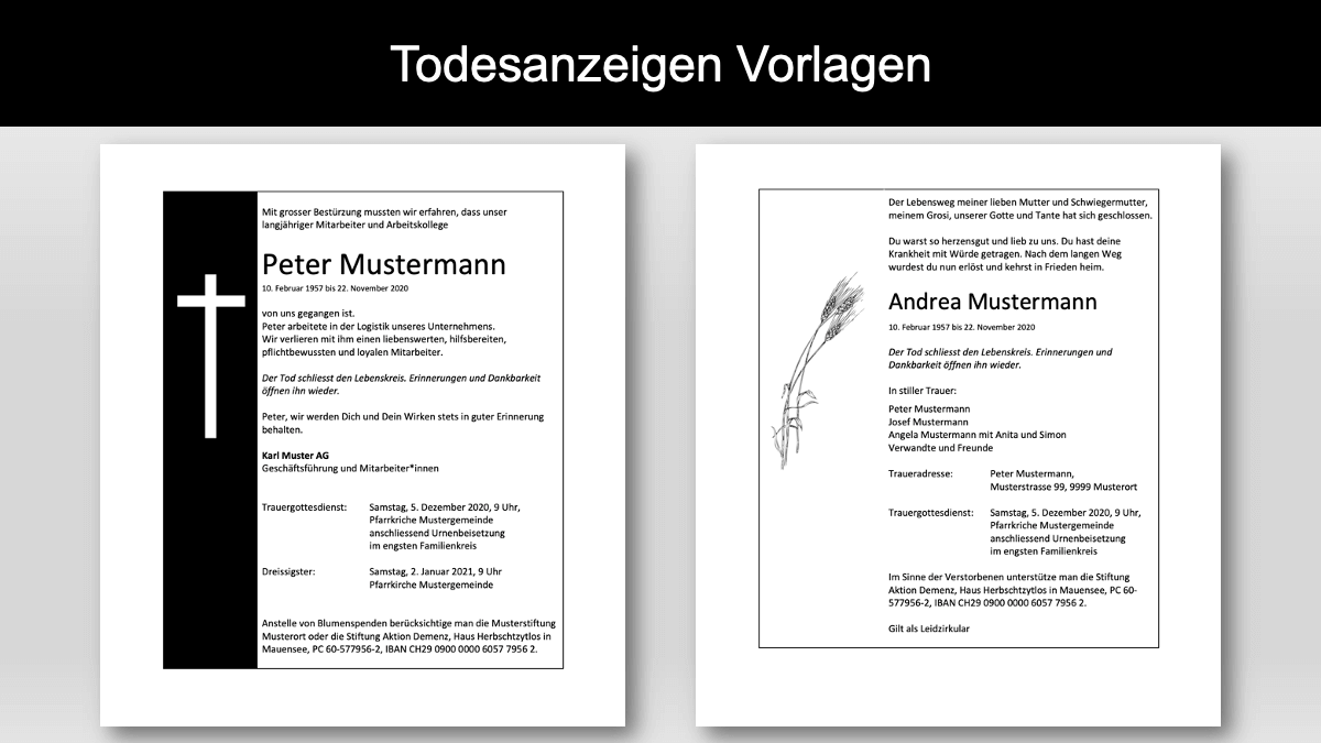 Eine traueranzeige könnte zum beispiel so aussehen. Persönliche todesanzeigen traueranzeigen selbst gestalten texte beispiele vorlagen. Sie können sich einen ersten eindruck darüber verschaffen wie eine patientenverfügung aussehen kann und können sich eventuell besser überlegen was für maßnahmen sie bei welchen krankheitsbildern und symptomen wünschen oder ablehnen. Unsere lebenslauf muster erfüllen allen personalchefs genau diesen wunsch.