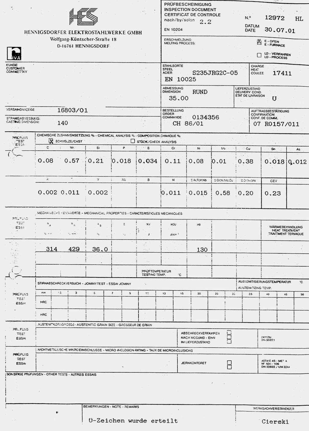 En 10204 type 2 1 certifikat hvor producenten alene bekræfter at materialet er iht. 10 tafeln blech en 10029 20ax1500x3000. Werksbescheinigung 2 1 nach en 10204 certificate of compliance acc. To en 10204 bestellangaben order specifications auftraggeber customer max mustermann gmbh bestell nr.