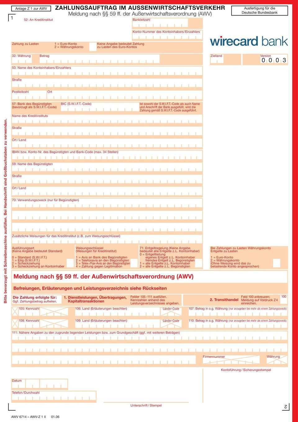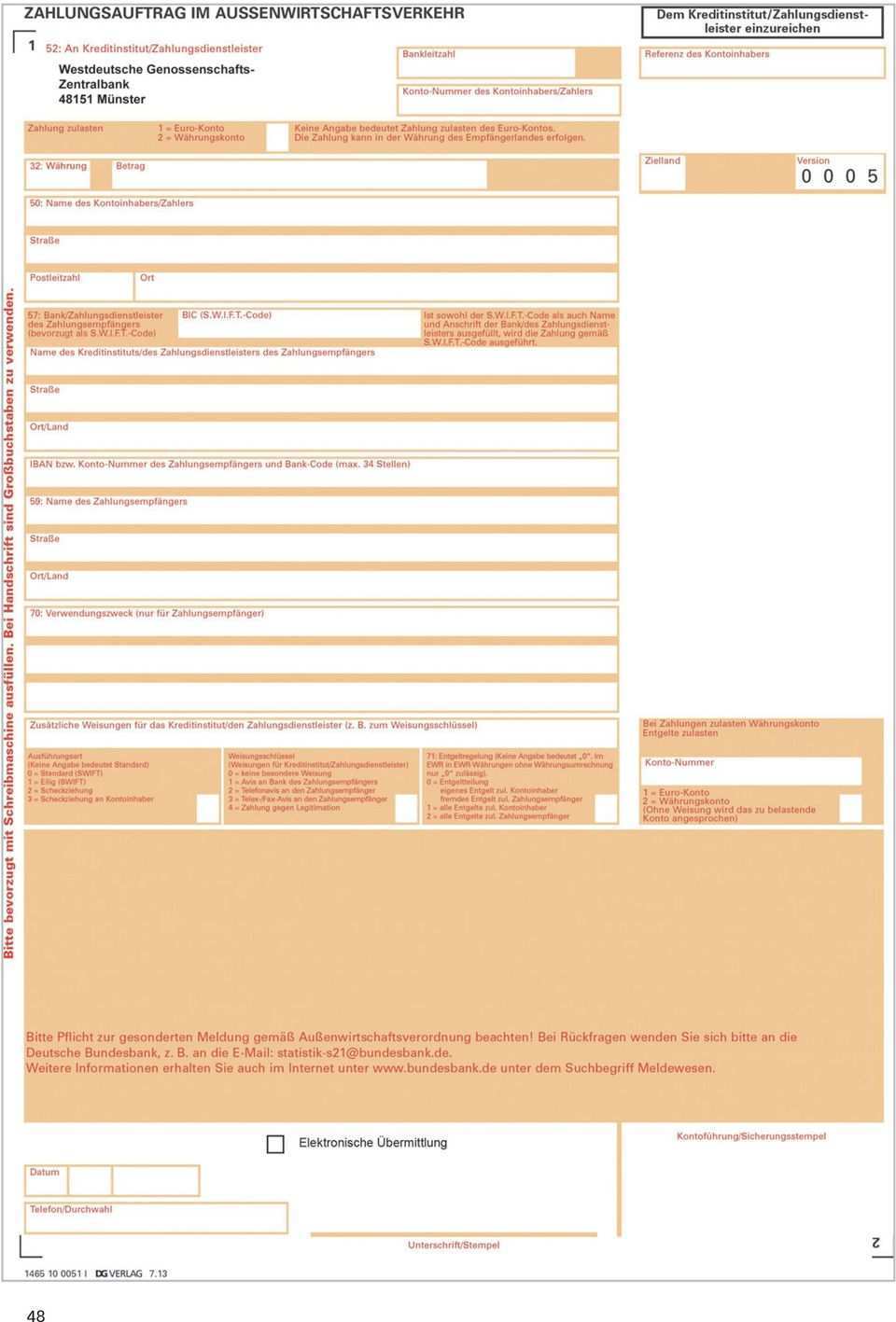 Zahlungsauftrag im aussenwirtschaftsverkehr muster. Die zweite seite des formulars ist für ihre unterlagen bestimmt. Foreign trade and payments transactions is aussenwirtschaftsverkehr according to schaefer hyperbook wirtschaftsenglisch. Zahlung zu lasten 1 euro konto 2 währungskonto. Pdf datei 80 kb vereinigte volksbank maingau eg.