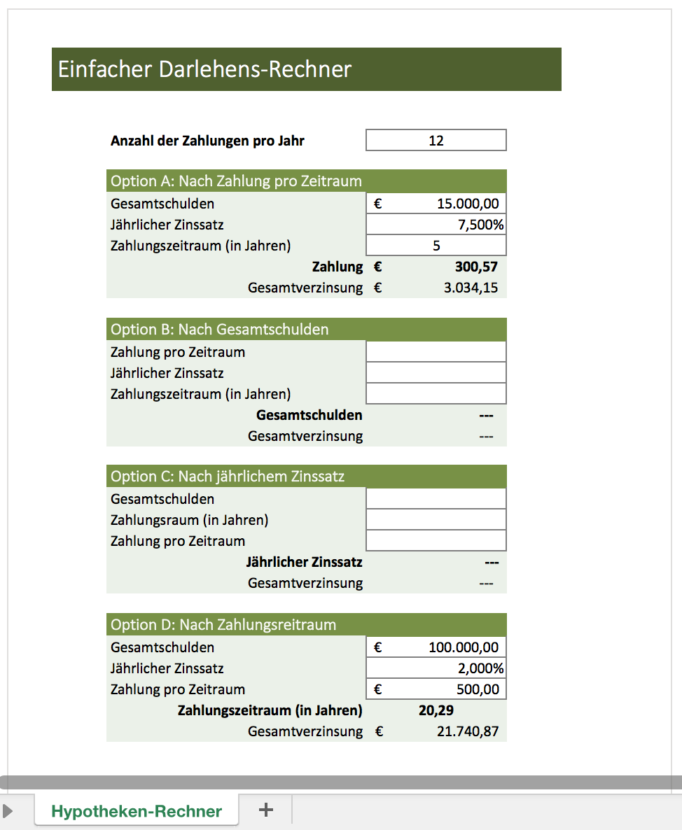 Zum einen die umfangreiche excelvorlage für ein hypothekendarlehen die einfache zinsberechnung oder der taggenauer zinsrechner. Geben sie einfach die kreditsumme den zinssatz die kreditlaufzeit und das anfangsdatum in den excel darlehensrechner ein und alle monatlichen rückzahlungsraten und zinskosten bis zur endgültigen tilgung werden berechnet. Die angebotenen excel vorlagen sind teilweise kostenlos. Der einfache darlehensrechner für verschiedene ausgangslagen.