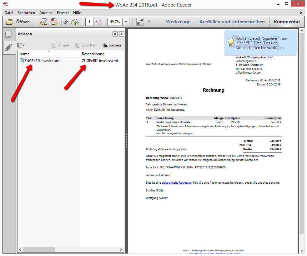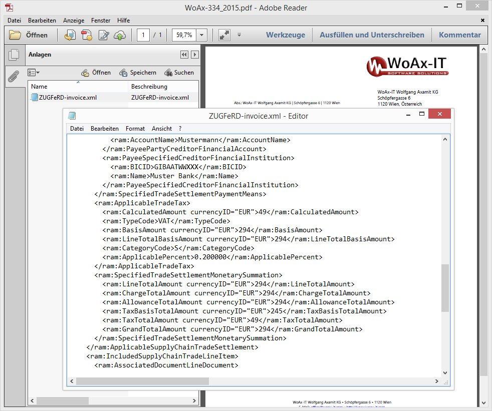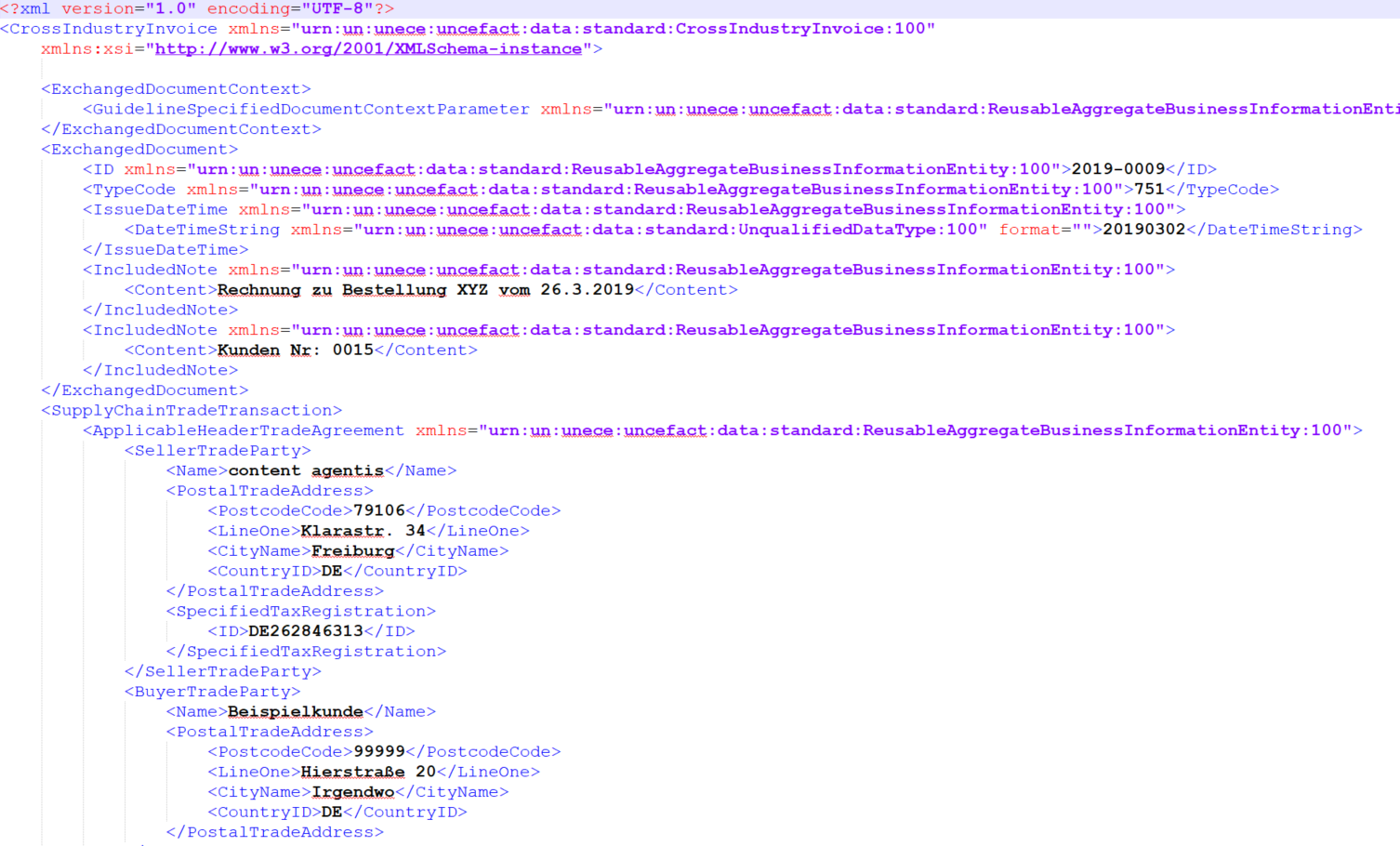 Die richtige lösung dafür sind e rechnungen als zugferd xml oder xrechnung. Hier finden sie ein einfaches beispiel um eine zugferd xml rechnung zu erstellen. Sie müssen wie andere geschäftsrelevante elektronische dokumente digital archiviert werden. Diese vorschriften gelten zunächst ab dem 27 11 2018 bindend für alle bundesministerien wie auch verfassungsorgane.