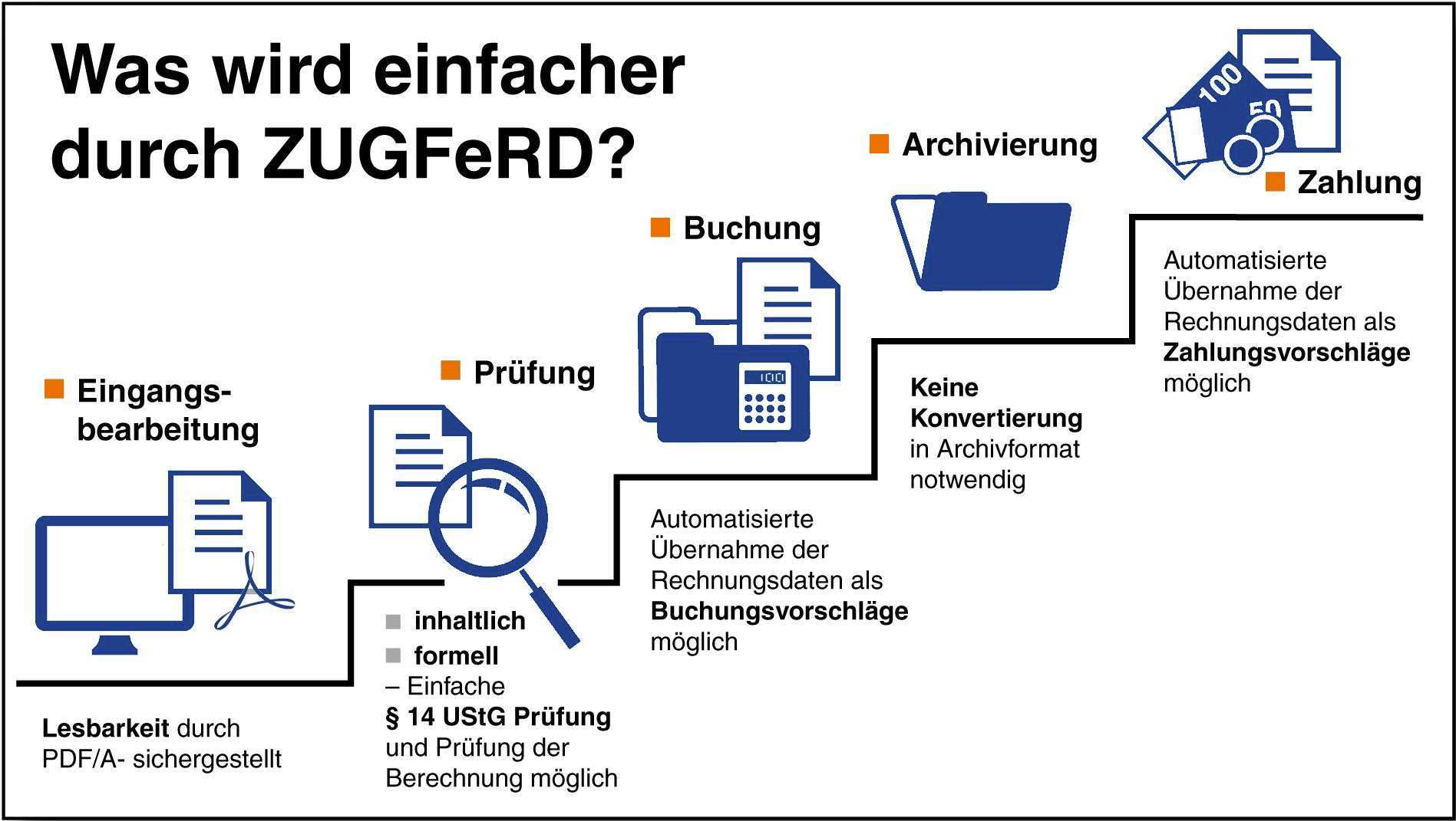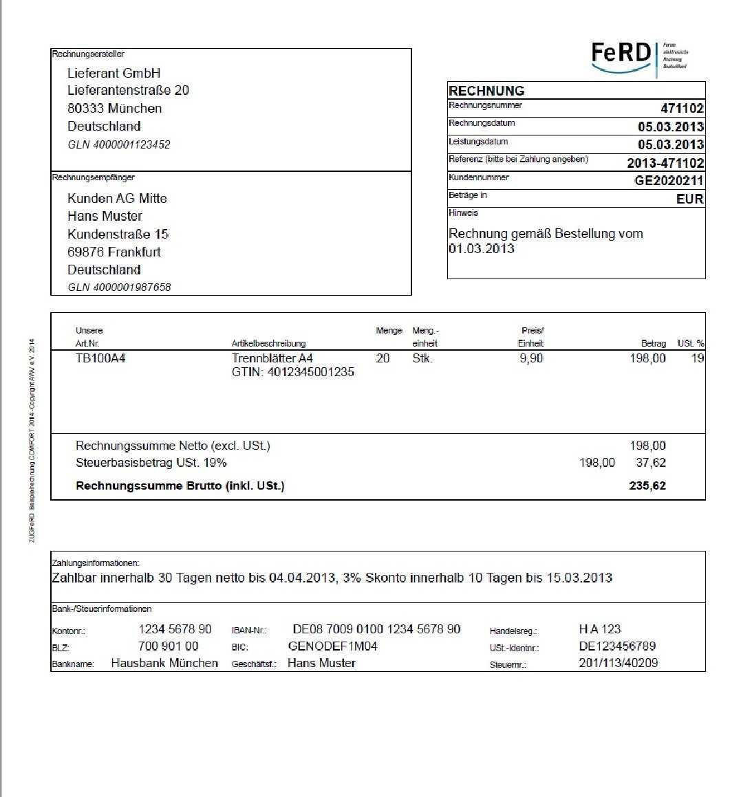 E rechnungen im zugferd format was steckt dahinter. Zugferd zentraler user guide des forums elektronische rechnung deutschland ist das vom forum elektronische rechnung deutschland ferd entwickelte einheitliche rechnungsdatenformat für den elektronischen rechnungsaustausch und somit eins von mehreren möglichen datenmodellen. Elektronische rechnungen unterliegen in der regel der aufbewahrungspflicht. Empfehlungen halten davon ausgehen können dass die zugferd rechnungen optimal empfangen eingelesen und verwendet werden können.