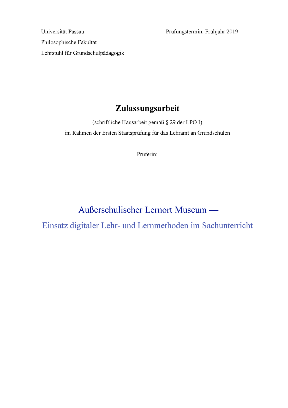 Zulassungsarbeit lehramt beispiel. Ein beispiel für ein sehr erfolgreiches werkzeug das im rahmen einer zulassungsarbeit an der lmu entstanden ist ist das baum visualisierungstool http www bvt ct labs de welches ein entdeckendes lernen in jgst. Zu erhalten dürfen sie ihre hausarbeit nicht in den erziehungswissenschaften und nur in ausnahmefällen in der fachdidaktik schreiben. Der umfang der zulassungsarbeit sollte zwischen 60 und 80 seiten betragen. Persönliche erklärung die zulassungsarbeit muss am schluss die in der prüfungsordnung vorgesehene erklärung enthalten.